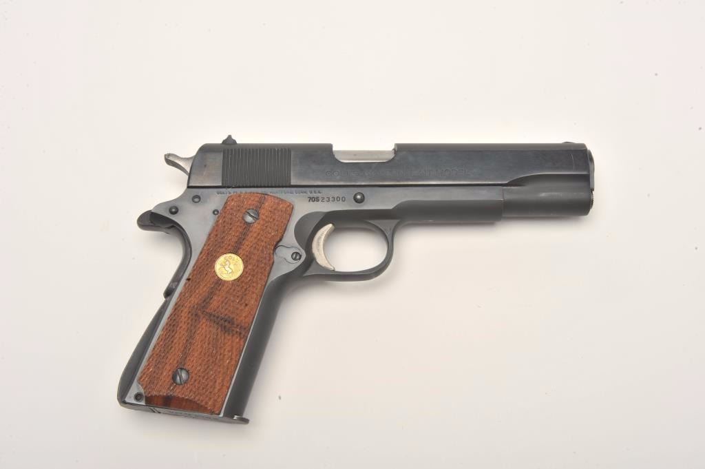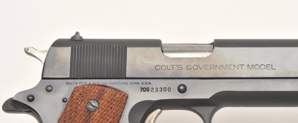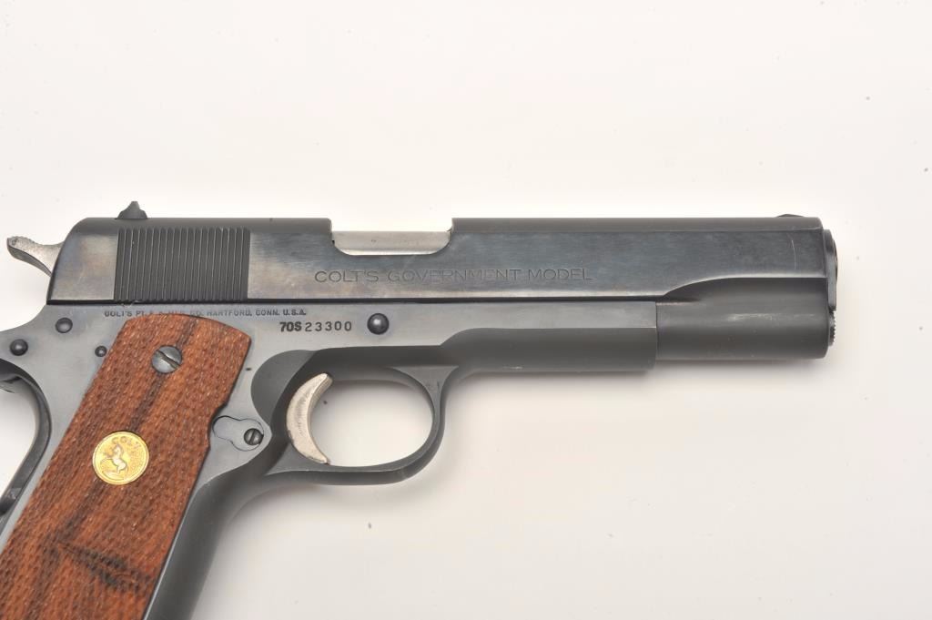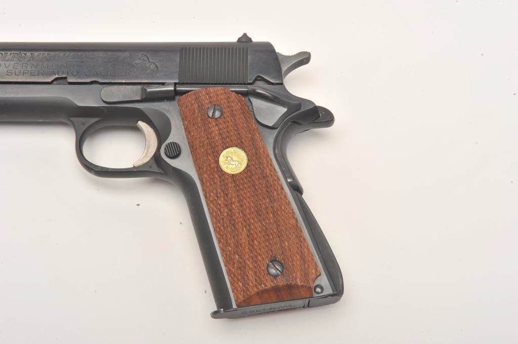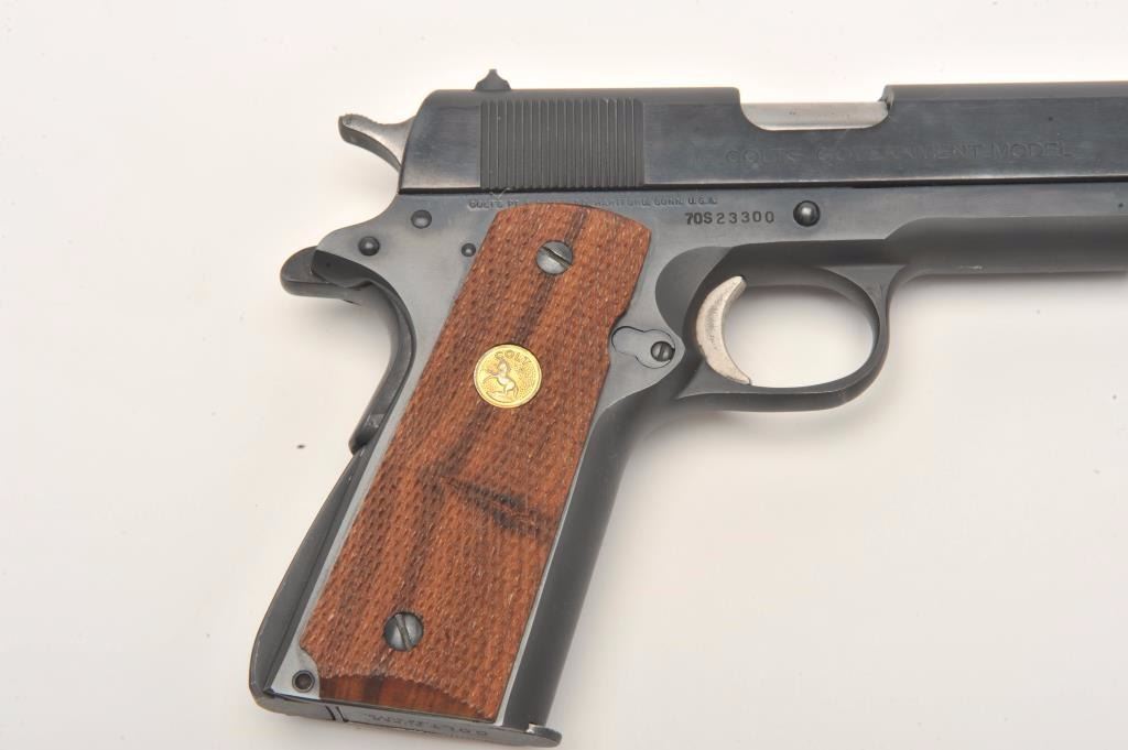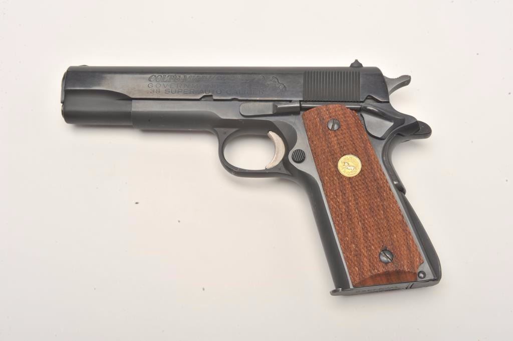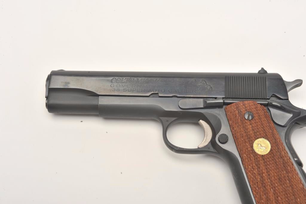 Colt MK IV/Series 70 semi-automatic Government Model pistol, .38 Super caliber, 5” barrel, blued finish, checkered wood medallion grips, S/N 70S23300, in excellent condition showing little use or handling. (Modern/No PPT/NO CALIF. SALE). Est.: $800-$1,600.