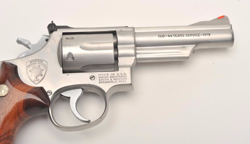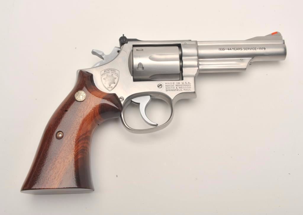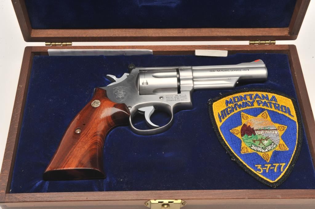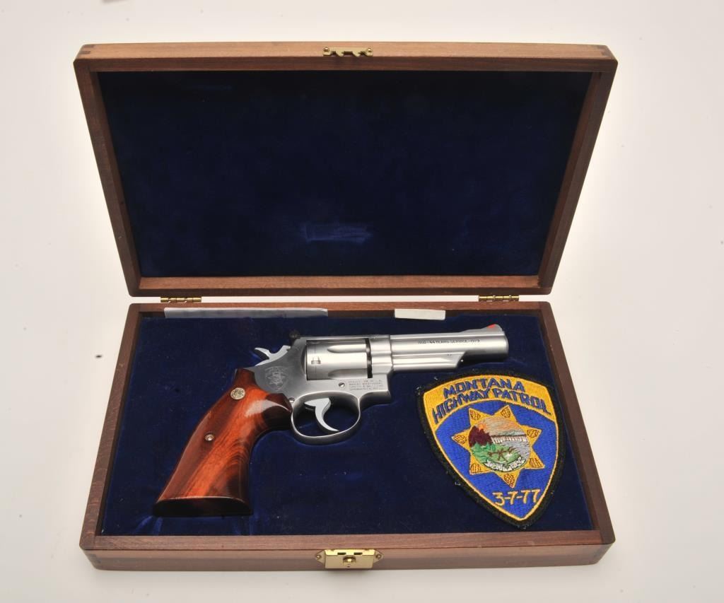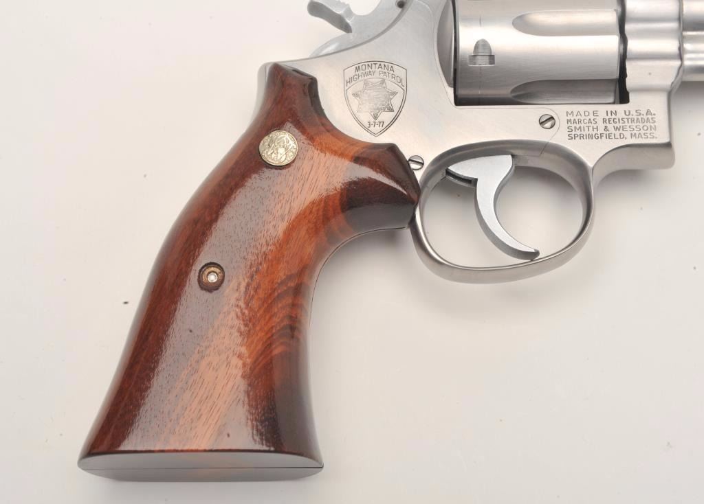 Smith & Wesson Model 66-1 DA revolver, Montana Highway Patrol Commemorative, in factory presentation wood case and MHP shoulder patch, .357 Magnum caliber, 4” barrel, stainless, wood medallion grips, S/N45K4935; gun is in like new condition. (Modern/No PPT). Est.: $700-$1,400.