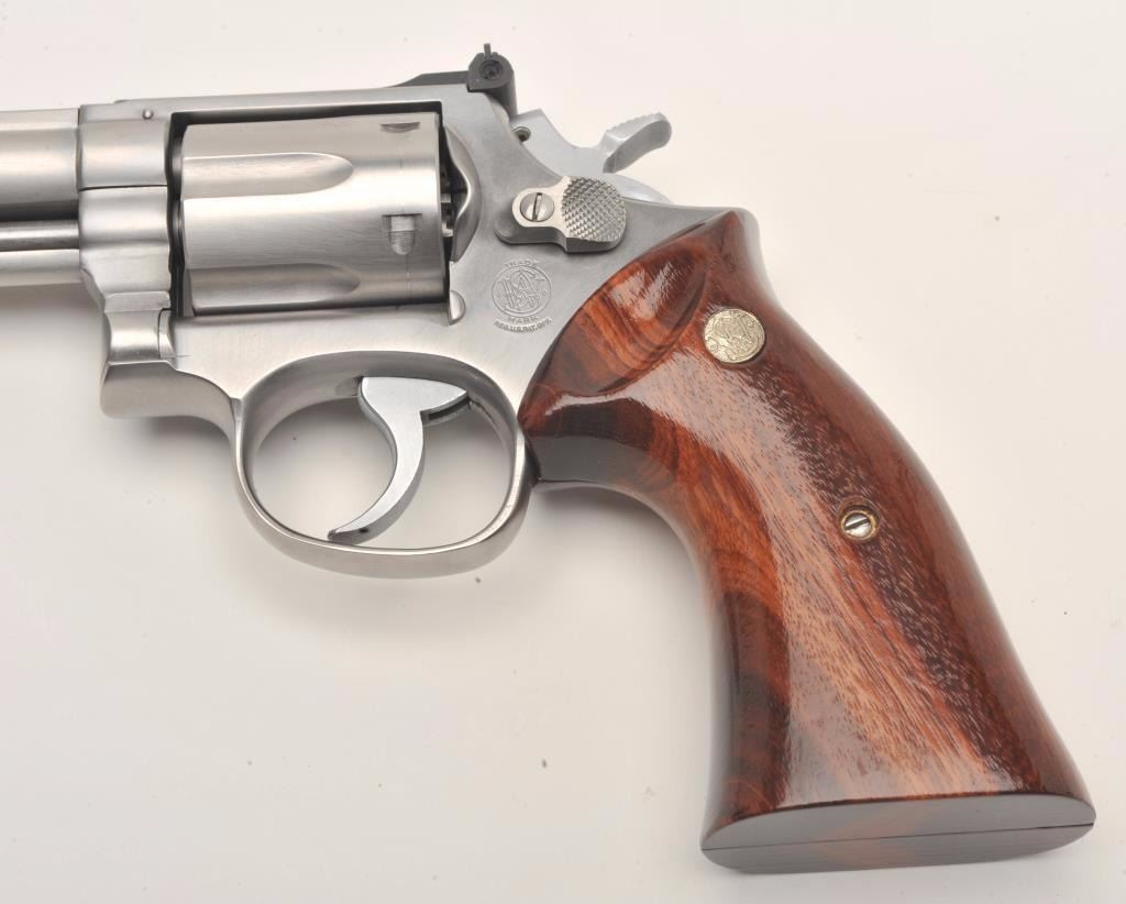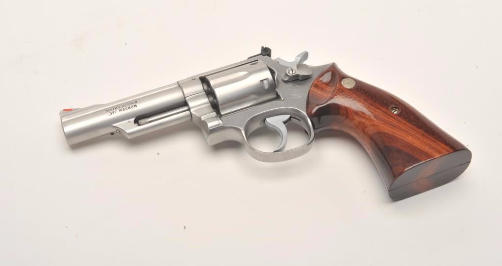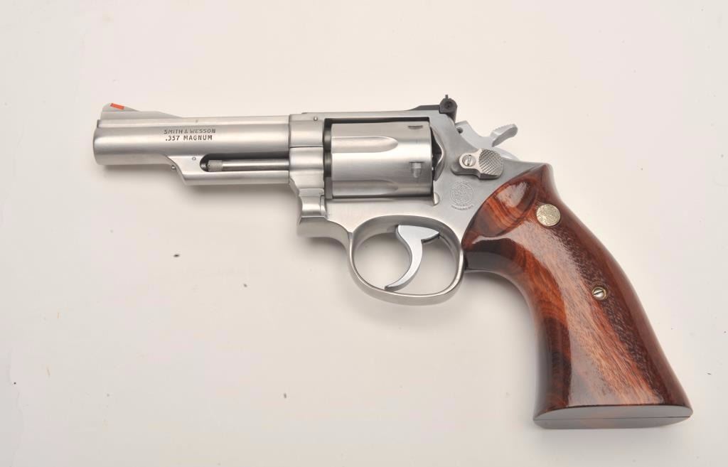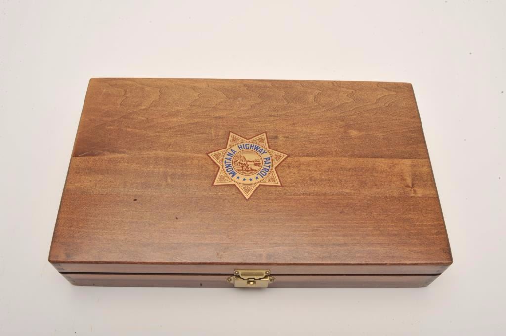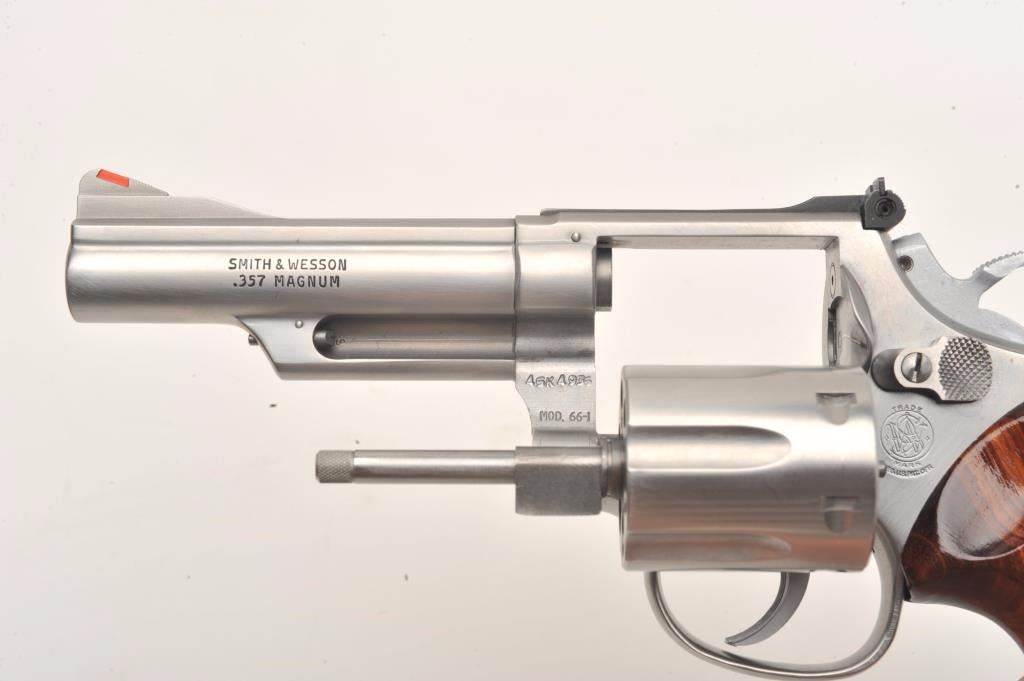 Smith & Wesson Model 66-1 DA revolver, Montana Highway Patrol Commemorative, in factory presentation wood case and MHP shoulder patch, .357 Magnum caliber, 4” barrel, stainless, wood medallion grips, S/N45K4935; gun is in like new condition. (Modern/No PPT). Est.: $700-$1,400.