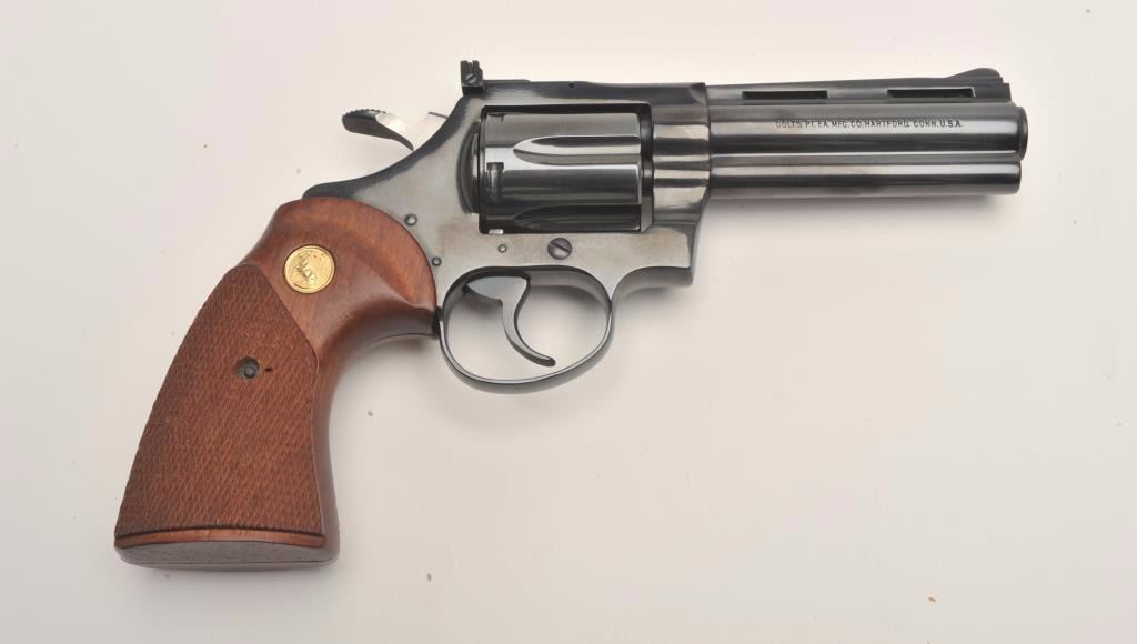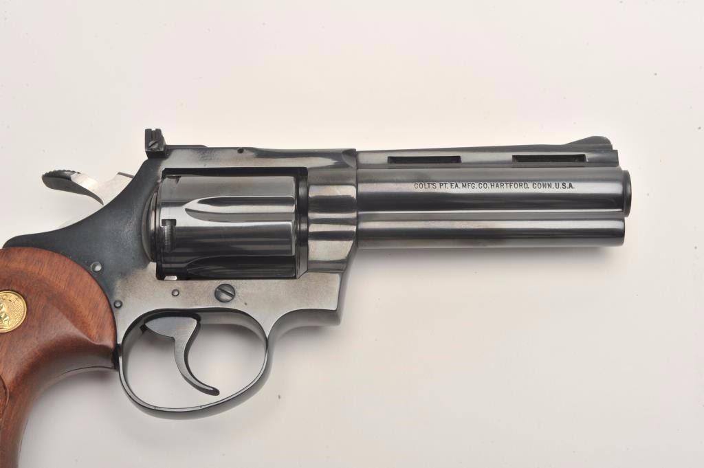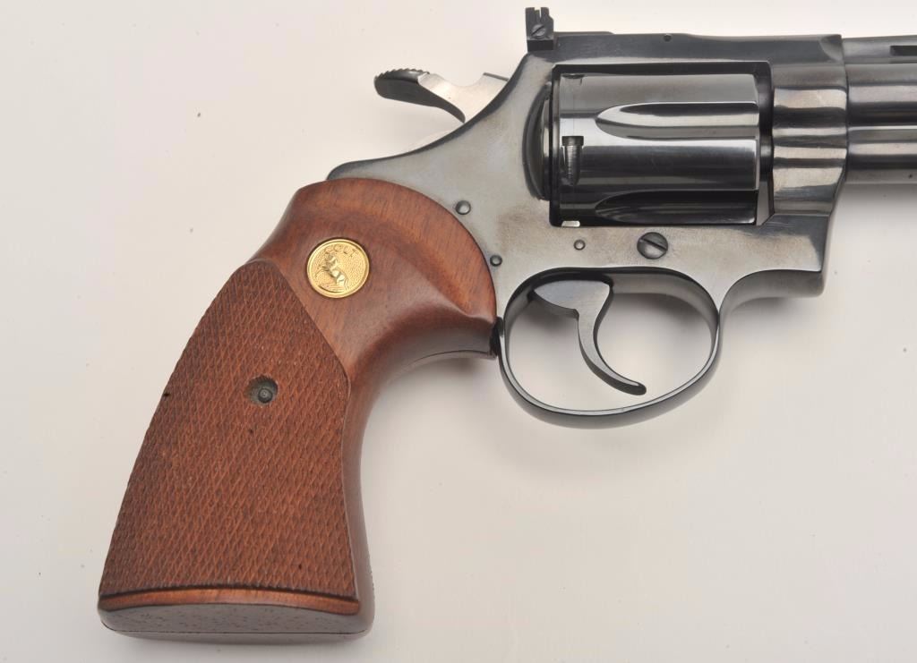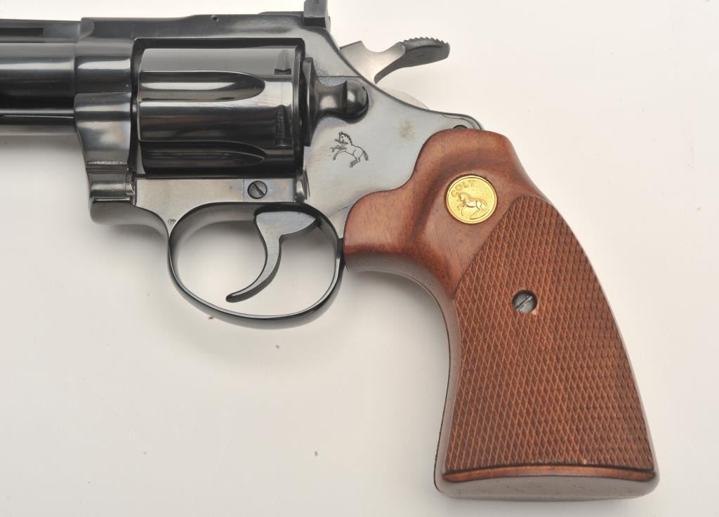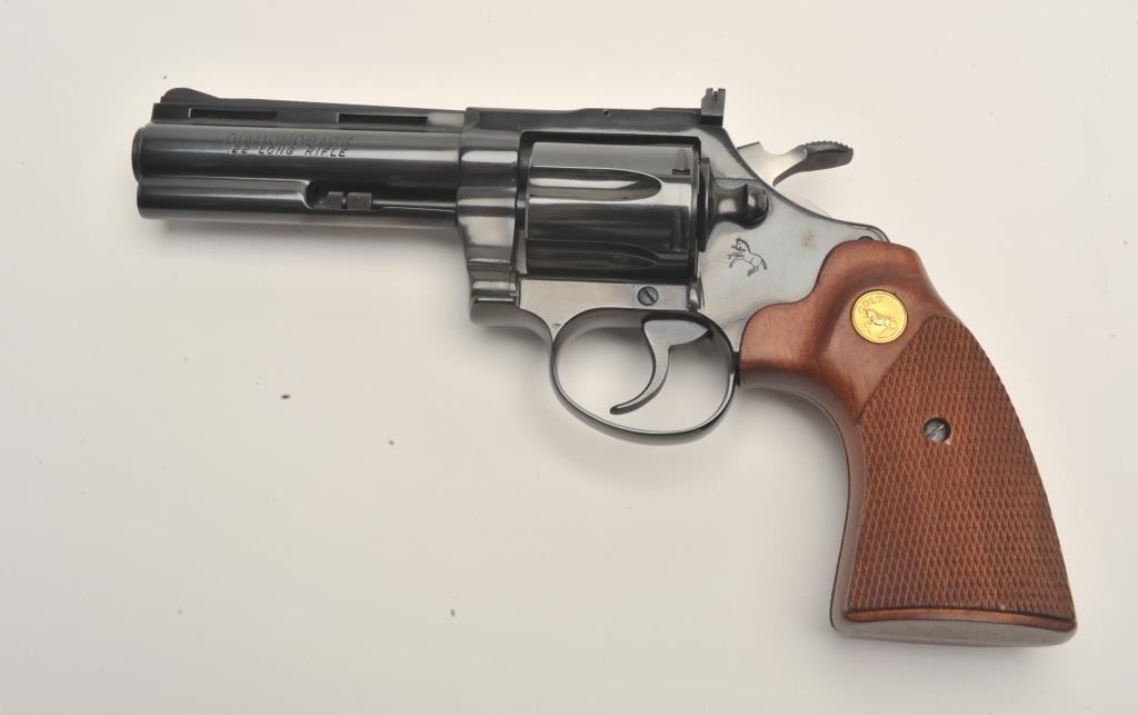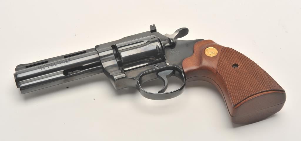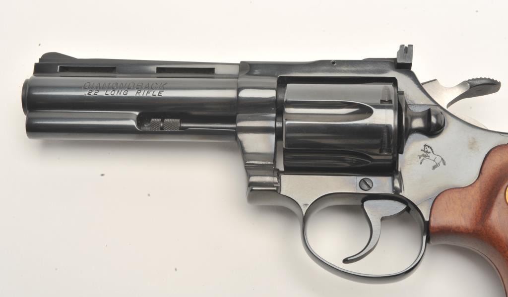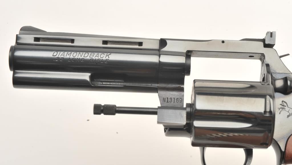 Lot 965 Colt Diamondback DA revolver, .22LR caliber, 4” barrel, blued finish, checkered wood medallion gri
