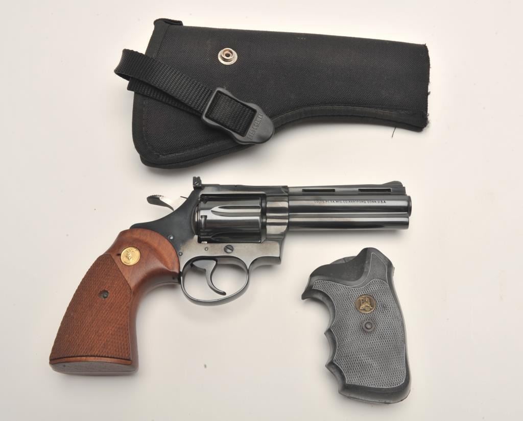Colt Diamondback DA revolver, .22LR caliber, 4” barrel, blued finish, checkered wood medallion grips, S/N N13169, in overall near new condition with extra pair of Pachmayr grips and a woven fabric holster.(Modern/No PPT/NO CALIF. SALE). Est.: $800-$1,600.