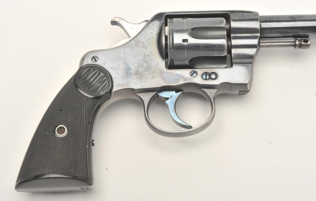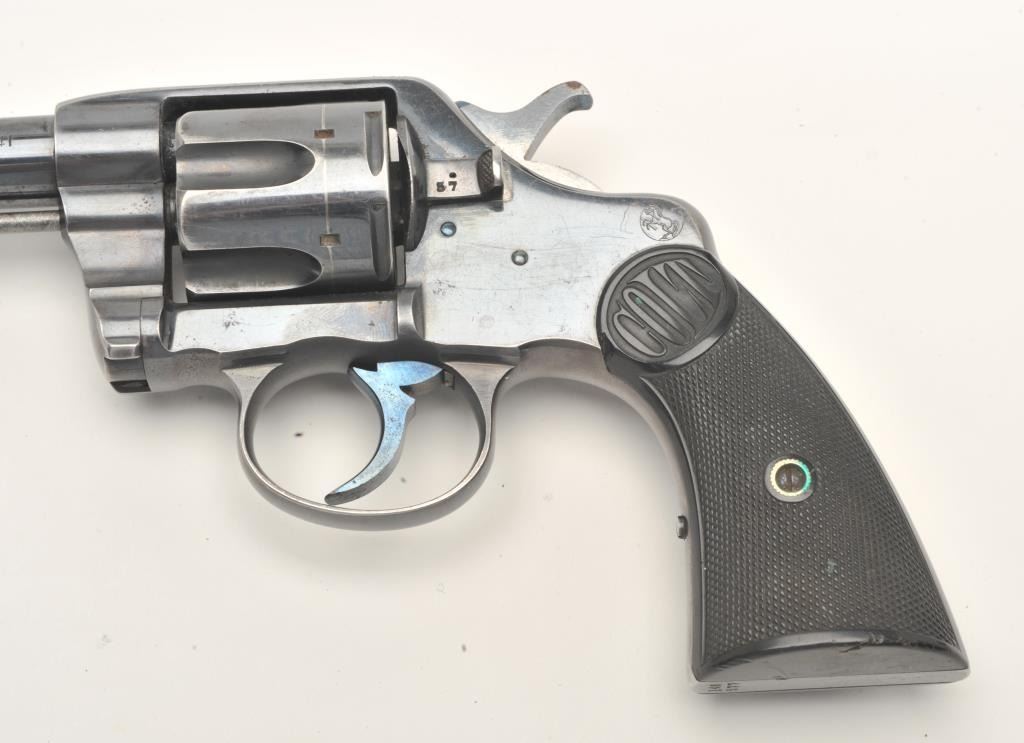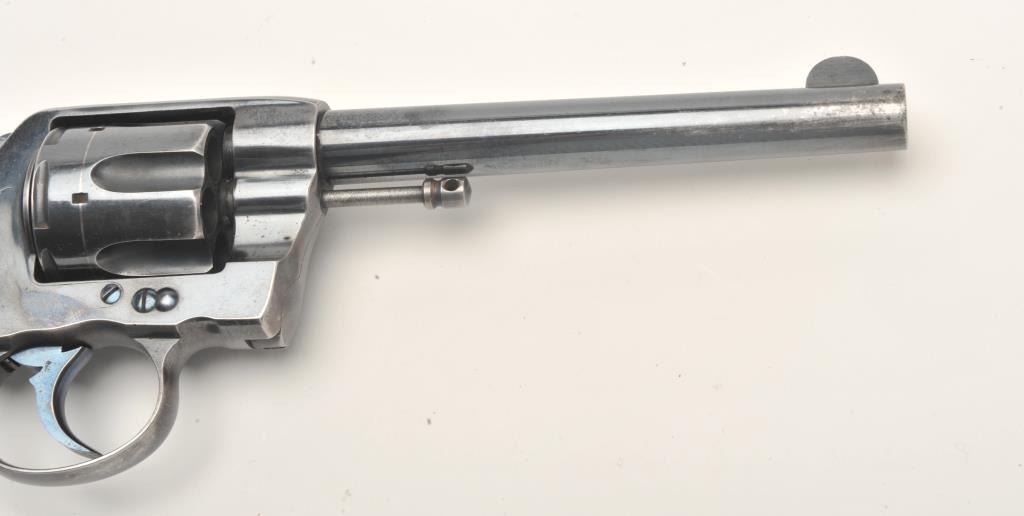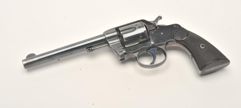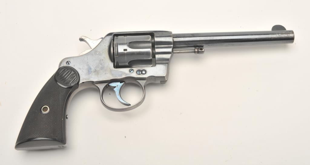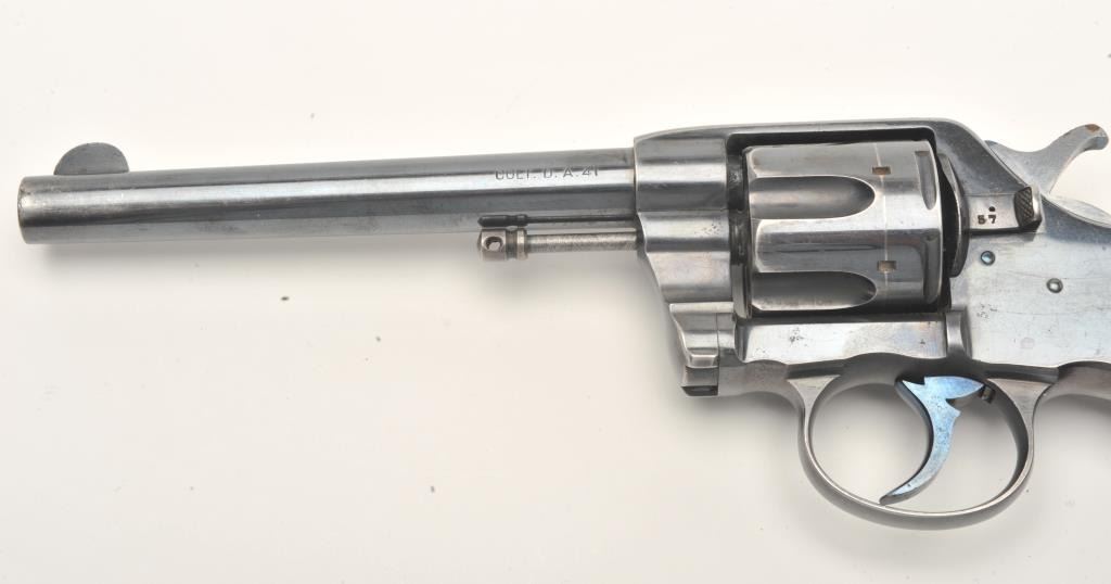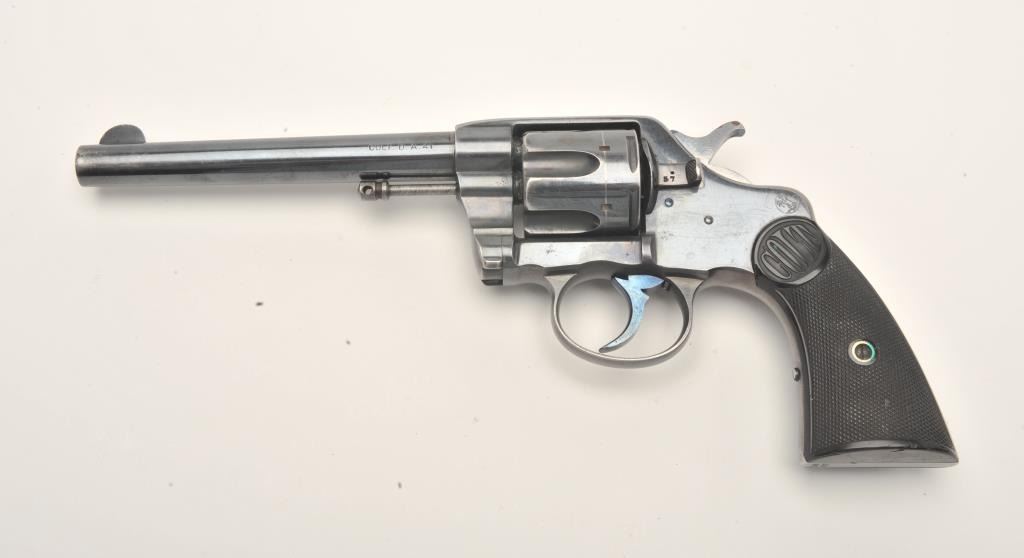 Colt DA revolver, .41 caliber, 6” barrel, blued finish, checkered hard rubber grips, S/N 148577, in overall fine condition displaying approximately 90%+ of its original finish, fine bore, crisp action, sharpmarkings and very good grips. (C&R/No PPT). Est.: $500-$1,000.