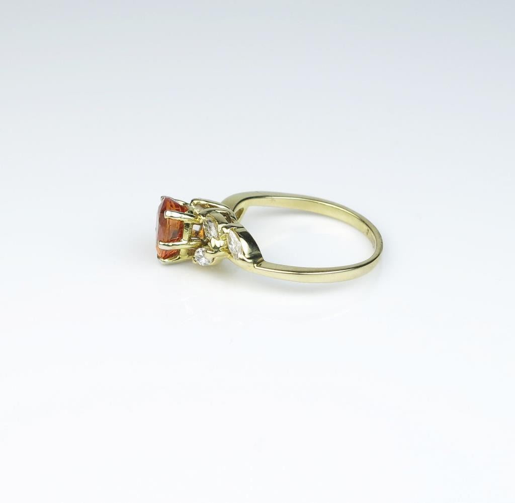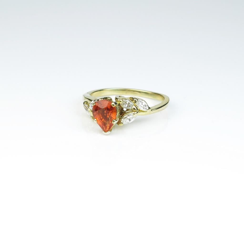 Gorgeous ring featuring an Orange sapphire weighing approx. 1.50 carats and surrounded by six matching MQ cut diamonds weighing approx. 0.60 carats of G-H colors and VS clarity in a 14 karat yellow gold setting.Retail $2,000-$3,000 Estimates $1,000-$1,500 Nice