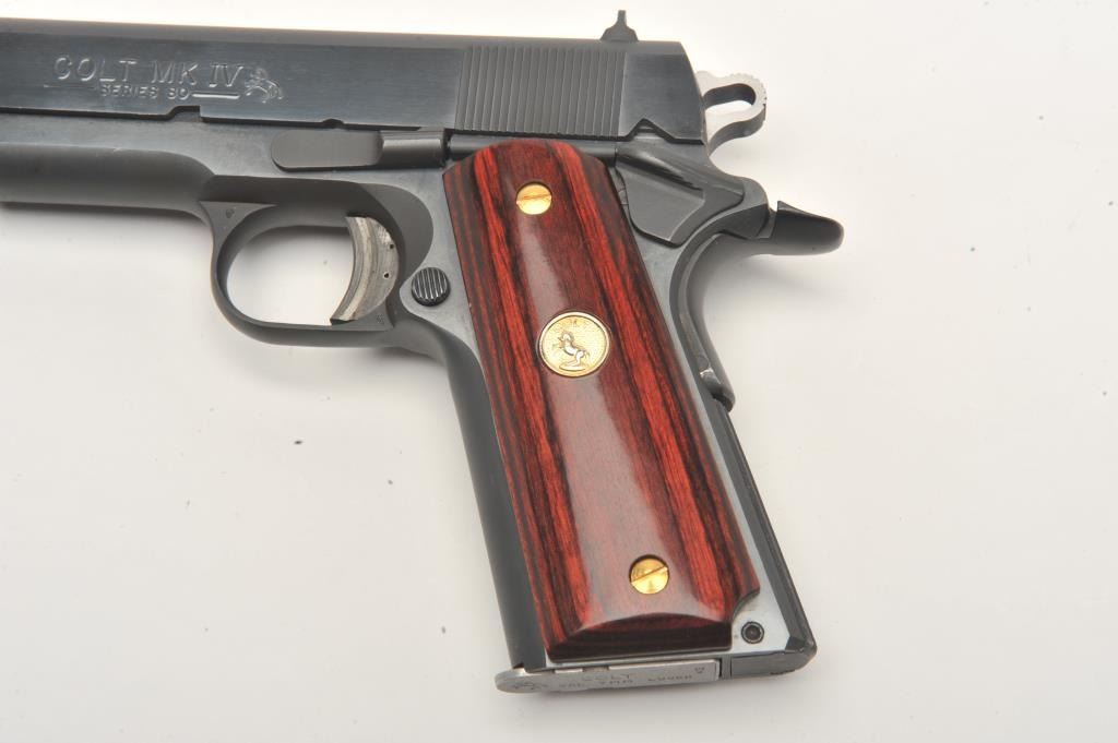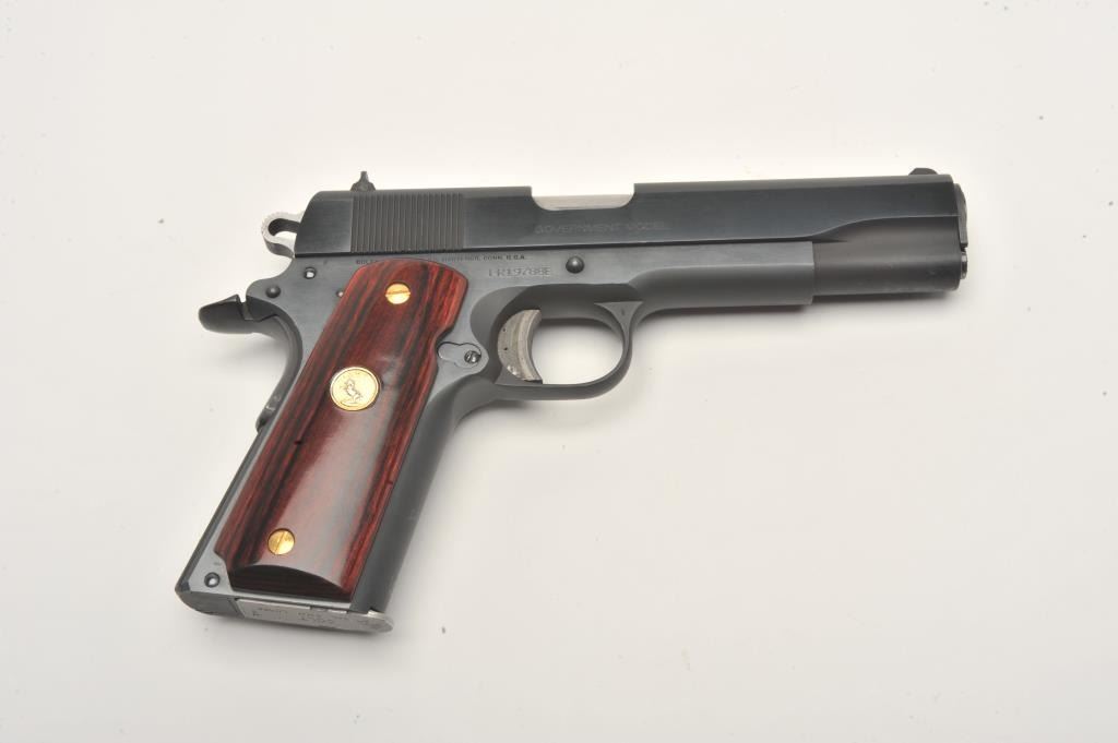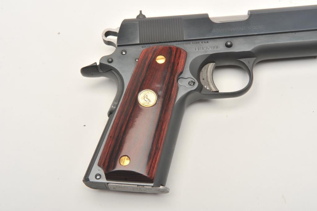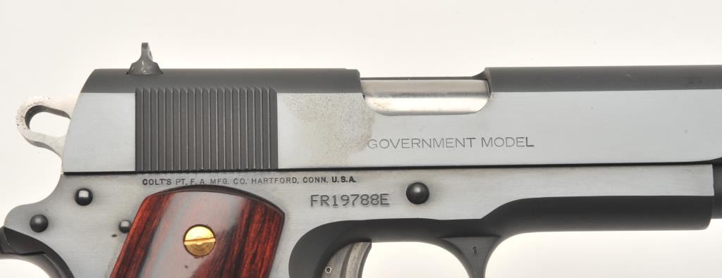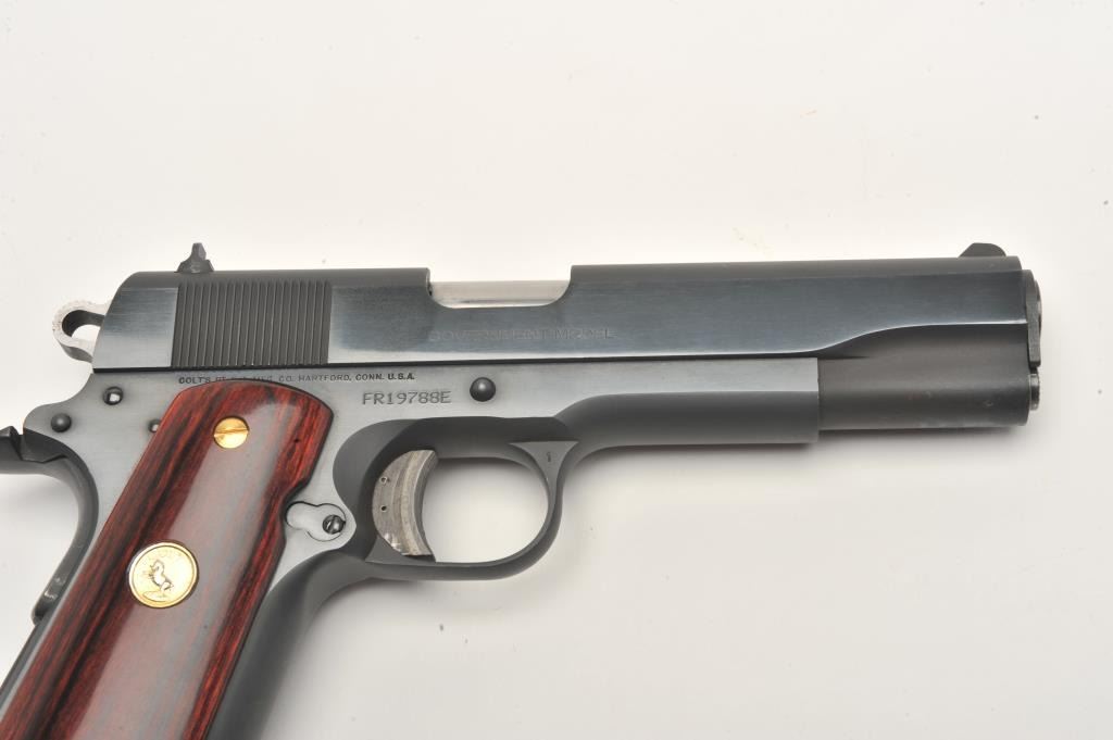 Colt MK IV/Series 80 Gov’t Model semi-automatic pistol, 9mm Luger caliber, 5” barrel, blued finish, wood medallion grips, two extra magazines, S/N FR19788E, in overall fine to excellent condition showingapproximately 99% original finish, fine bore, action, markings and grips. (Modern/No PPT/NO CALIF. SALE). Est.: $600-$1,200.