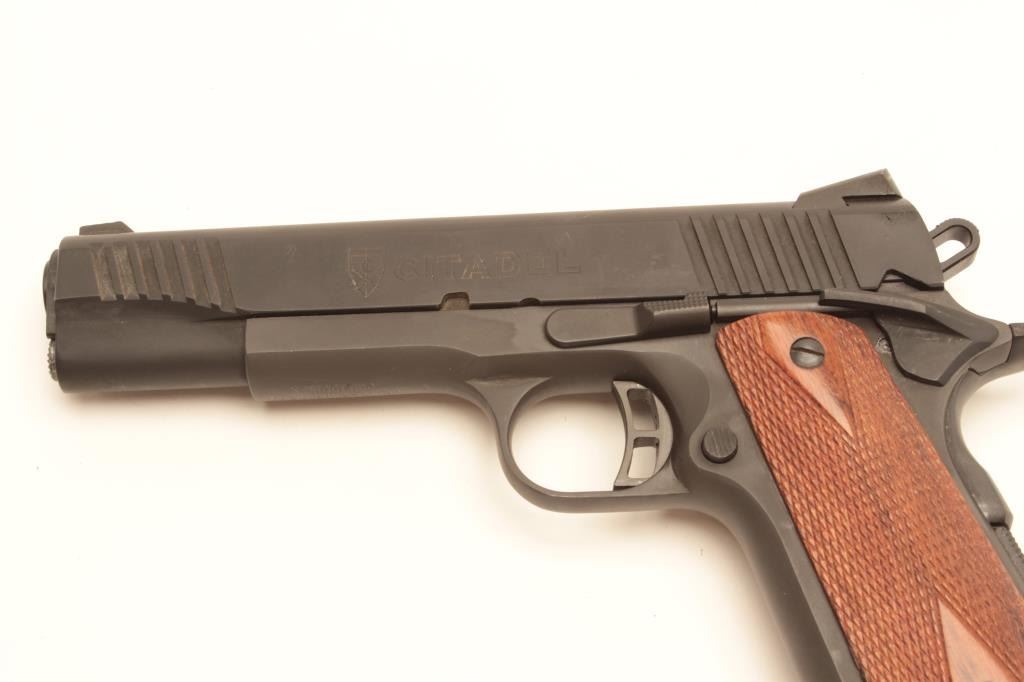 Citadel Model 1911-A1 semi-automatic pistol, .45 caliber, 5” barrel, mat black finish, checkered wood grips, S/N CIT002279, in hardcase with instructions and one extra magazine. This pistol is in fine toexcellent condition showing approximately 99% finish, crisp action, excellent bore, sharp markings and fine grips. (Modern/NO CALIF SALE). Est.: $500-$1,000.