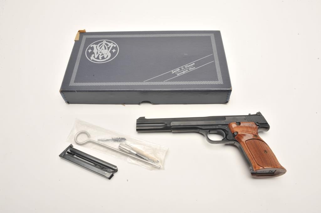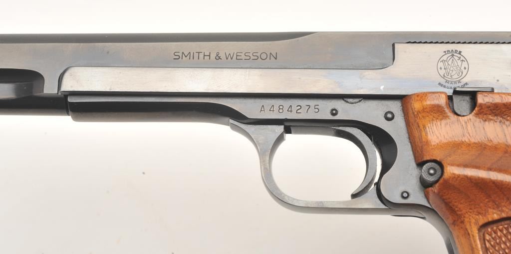 Smith & Wesson Model 41 semi-automatic target pistol, .22LR caliber, 7” barrel, blued finish, checkered wood target grips, S/N A484275, with factory blue two piece cardboard box, one extra magazine andcleaning accessories. This gun is in fine to excellent overall condition displaying approximately 99% original finish, fine bore, action, markings and grips. (Modern/No PPT). Est.: $750-$1,500.