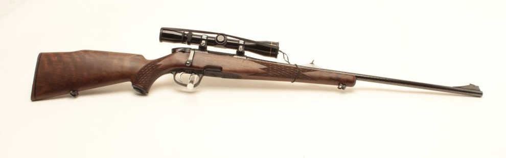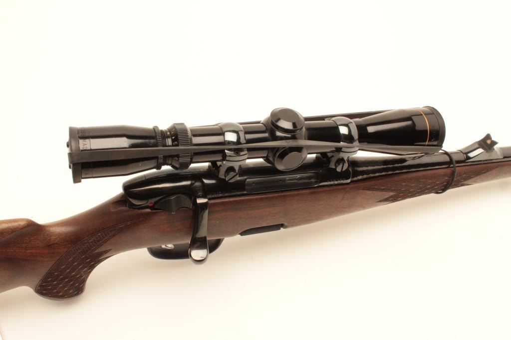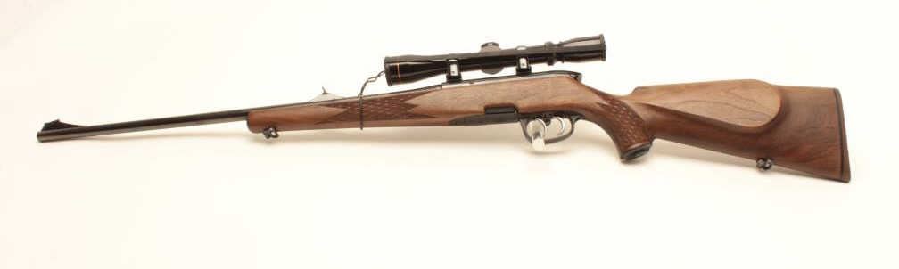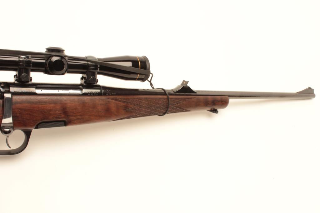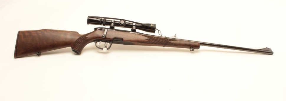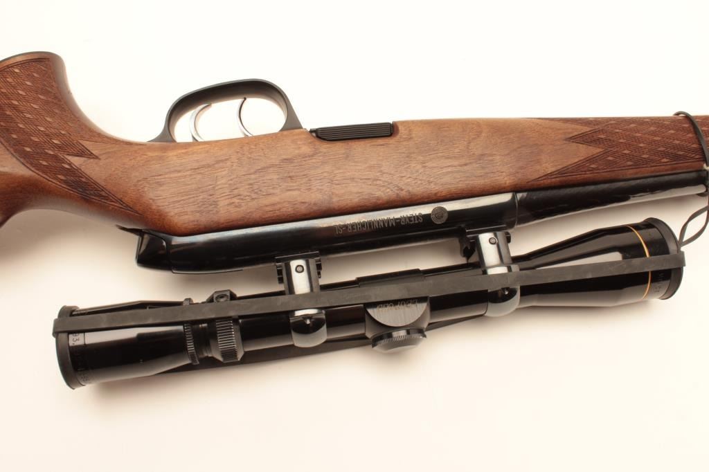 Steyr-Mannlicher-SL bolt action rifle, double set triggers, .223 Rem. caliber, 24” barrel, black finish, checkered wood stock with sling swivels, S/N 178380, mounted with a Leupold 3x9 scope displaying sharp optics, in overall fine condition with majority of original finish remaining on metal surfaces, fine bore, crisp action, sharp markings and fine stock. (Modern/No PPT). Est.: $800-$1,600.