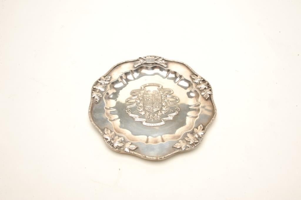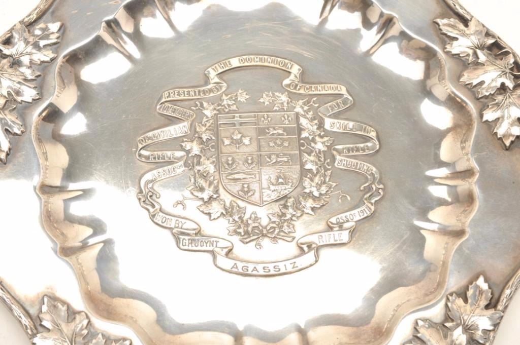 Elaborate sterling silver shooting prize plaque signed “Birks” who were the Canadian equivalent of Tiffany. The plaque measures 11” across the center showing arms, target and oak leafs around the rim. The crest atthe center in relief with scrolls reading “The Dominion of Canada, for Skill in Rifle Shooting, Presented by Members of Civilian Rifle Assoc, Won by G.R. Joynt, Agassiz, Rifle Assoc, 1911”. Weighs 33.5 oz. A coveted prize that shows fine artistry and antiquity. Est.: 500-1,000