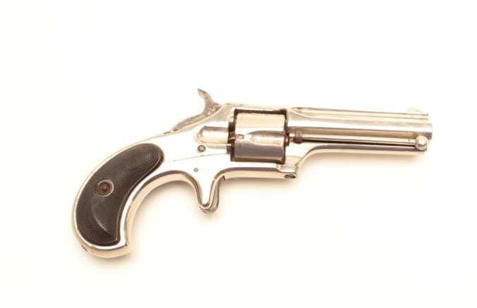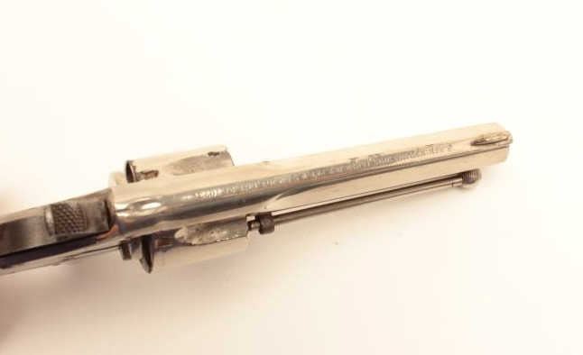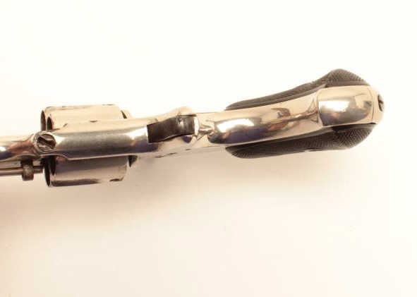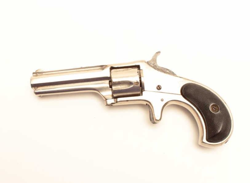 Remington Smoot revolver, .32 caliber, Serial #NSNV. The pistol is in very good overall condition with a 2 ¾” barrel. The pistol retains the majority of its nickel finish with wear at the muzzle, small mars on top of the barrel and a buggered screw on the underside. The checkered hard rubber grips are in good condition showing light wear and use with only handling marks noted. The bore is good, the action crisp and markings aresharp. Est.: $200-$400. (Antique).
