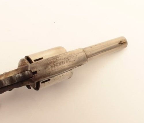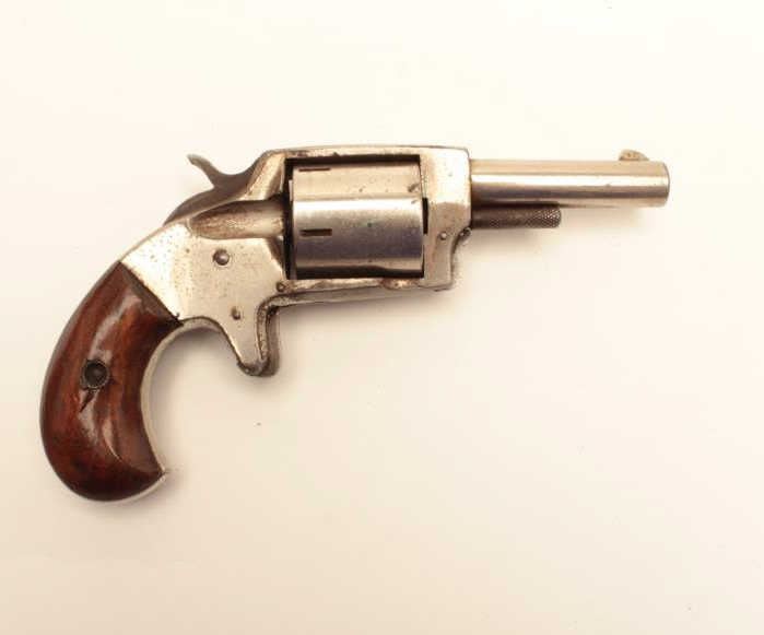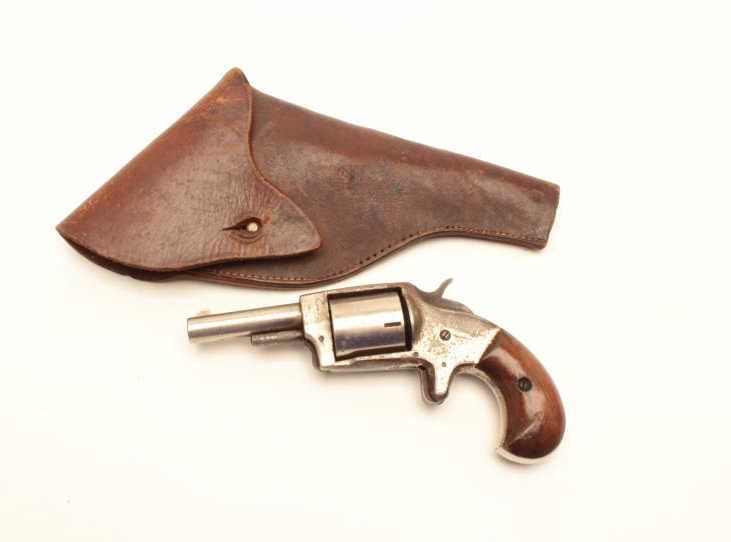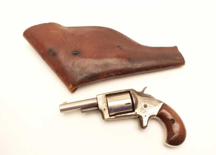 Iver Johnson Defender 89 revolver, .32 caliber, Serial #NSNV. The pistol is in good overall condition with a 2 ½” barrel. The pistol retains the majority of its nickel finish with losses at the rear of the frameand light surface erosion. The smooth wood grips are in good condition showing wear from carry and use. The bore is fair, the action functions and the markings are legible. The pistol includes a vintage leather flapholster in good condition. Est.: $50-$100. (C+R).