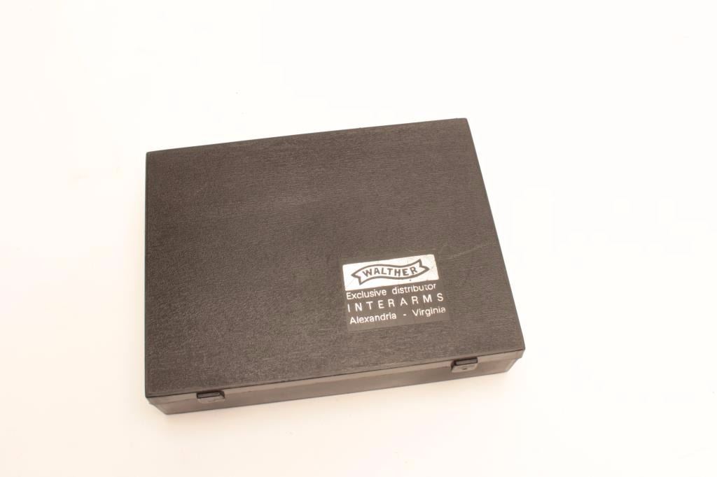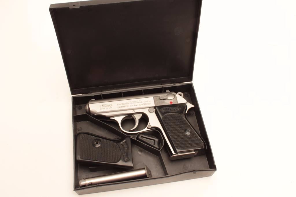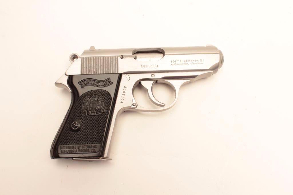 Walther PPK semi-auto pistol, .380 caliber, Serial #A008104. The pistol is as new in the box with an extra set of grip scales and two Walther marked magazines. The pistol is finished in stainless marked, “MADE IN USA”and is in as new condition showing only light handling marks. The barrel is marked 9mm Kurz/ .380 ACP caliber. The checkered plastic Walther marked grips are in very good condition showing only storage wear. Theblack plastic factory box is in good condition. The bore is very good, the action is crisp and markings are sharp on this new nearly new Walther in the factory box. The pistol is marked by Interarms on the rightside of the slide. Est.: $500-$1,000. (Modern).