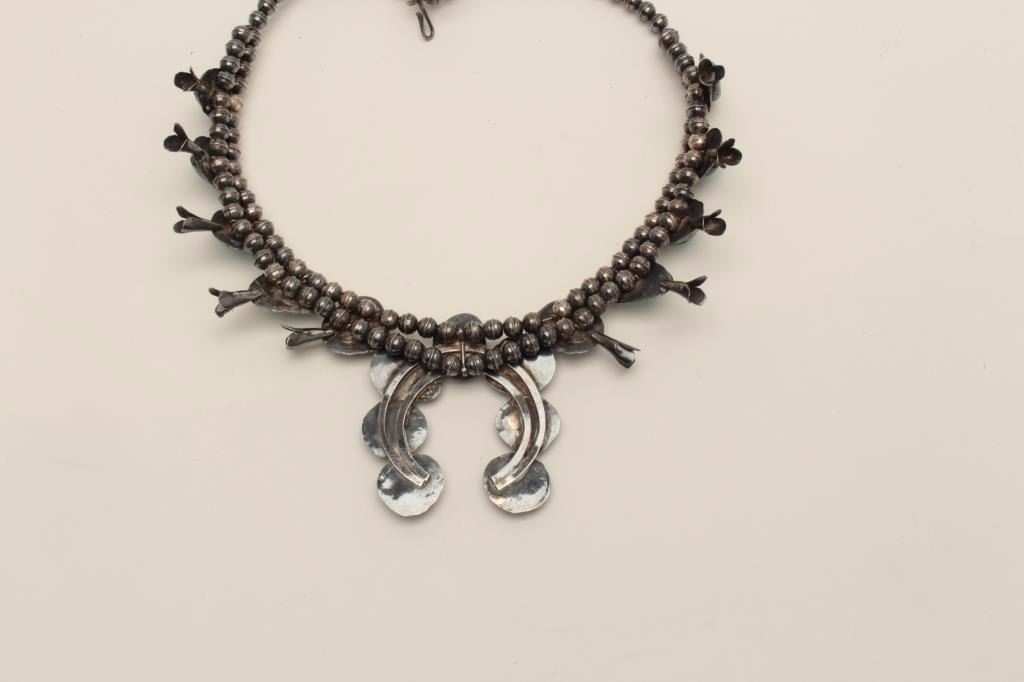 Lot 1016 Sterling Silver Squash Blossom style American Indian made Necklace mounted with turquoise. collect