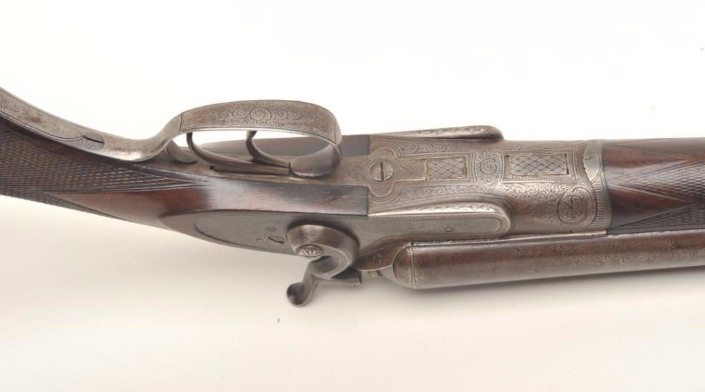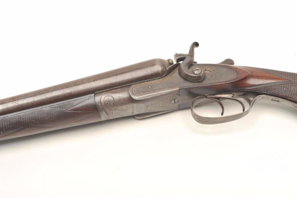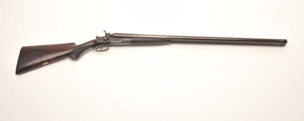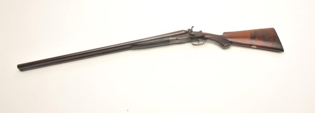 Manton & Richards side by side hammer shotgun, approximately 12 gauge, serial #10278. The shotgun is in good overall condition with 30” Damascus steel barrels with a full-length rib and brass bead frontsight. The barrel address reads, “Richards and Co. London Fine Damascus Field Gun”. The barrels have gone to a pleasing brown color while the muted case colors of the receiver have become silver with age. The receiver,tang and trigger guard all feature pleasing scroll engraving throughout. The finely checkered wood stocks are in good condition showing use with mars, dents and compressions. The butt stock ends with ahard rubber butt plate and a 14 ½” LOP to the front trigger. The bores are good, the action functions and the markings are crisp on this desirable hammer gun. Est.: $500-1,000. (Antique).