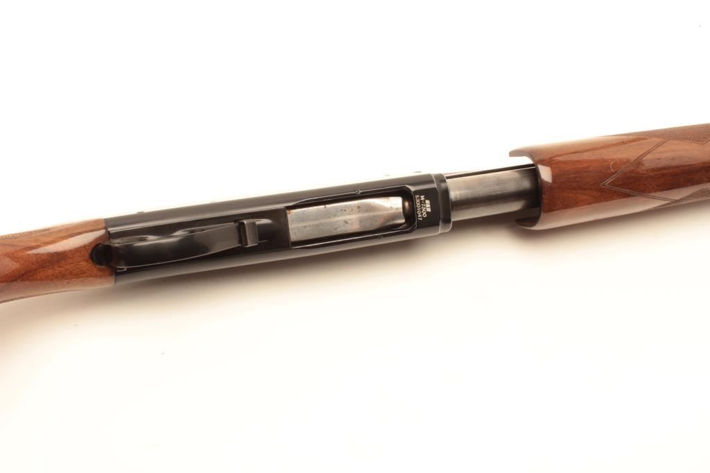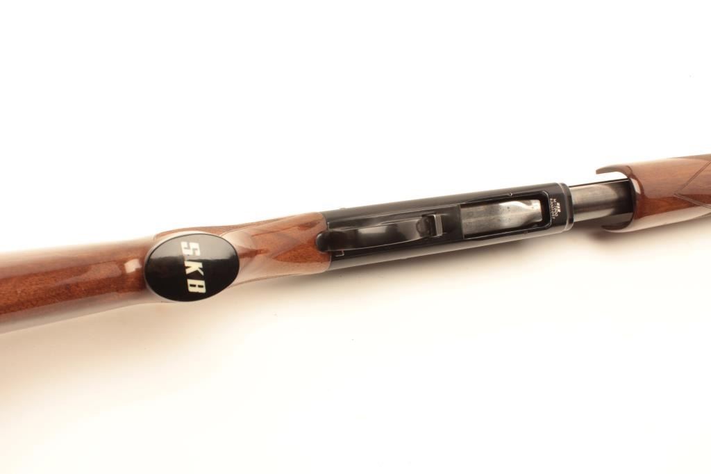 SKB Model 7300 pump action shotgun, 12 gauge, 30” ventilated rib barrel, blued finish, checkered wood stocks, S/N S3001047, in overall fine condition with majority of original finish, fine bore, action, markingsand stocks that show some minor old mars from storage. (Modern). Est.: $250-$500.