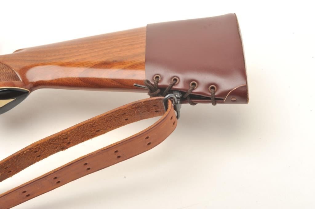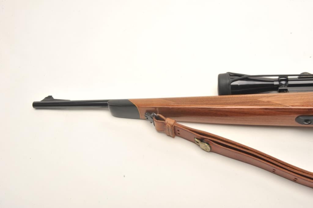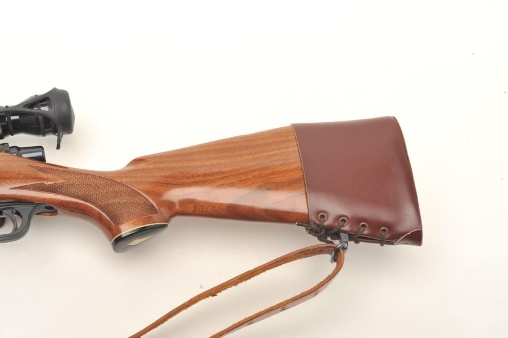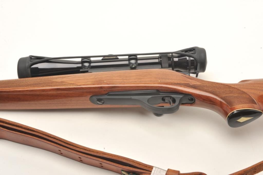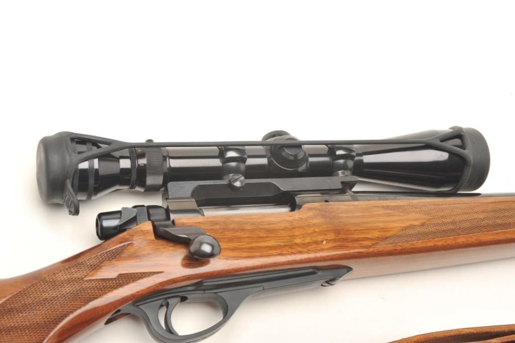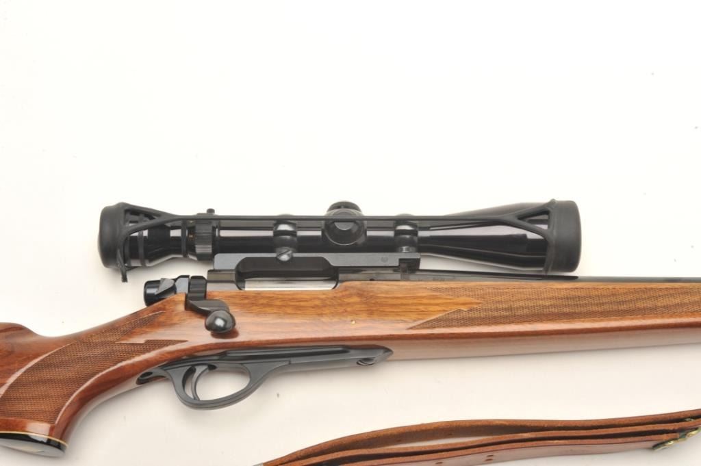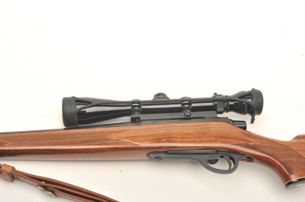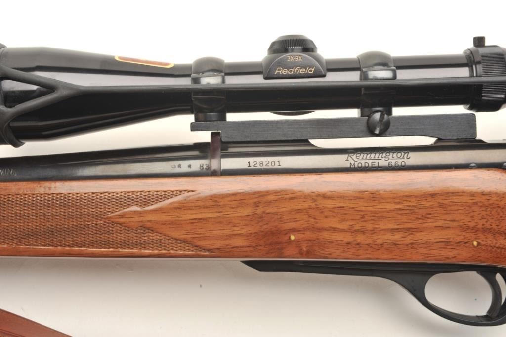 Remington Model 660 bolt action carbine, .308 Winchester, serial #128201. The carbine is in fine overall condition with a 21” barrel with a post front sight and rear sight removed. Other than a small scuff atthemuzzle, the barrel and receiver retain nearly all of their high polish blued finish. The checkered wood stock is in very good condition showing only light handling marks. The butt stock ends with a leatherrecoilsleeve. The rifle includes sling swivels and a leather military style sling. The gun is topped with a Redfield one piece scope mount and a Redfield 3x9x40 variable power scope. The rifle comes with theoriginal box. Afine example of a seldom encountered carbine in a great chambering. Est.: $500-$750. (Modern).