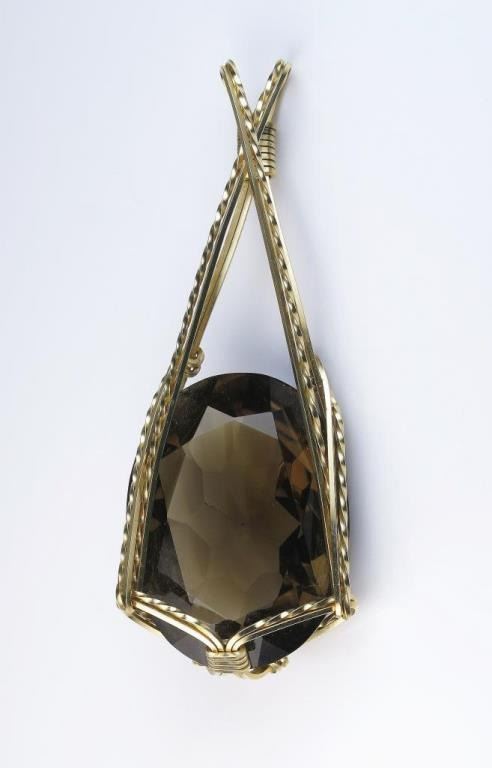 Huge handmade Sterling over gold plate necklace featuring a large smoky topaz weighing approx. 100-120 carats. Estimates $400-$600