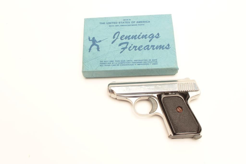 Jennings Model J-22 semi-automatic pistol, .22LR caliber, 2.5” barrel, nickel finish, checkered plastic grips, S/N 006919, in factory two piece cardboard box and in overall very good to fine condition with avery good bore, crisp action, very good grips and majority of original finish remaining. (Modern/PPT). Est.: $50-$100.