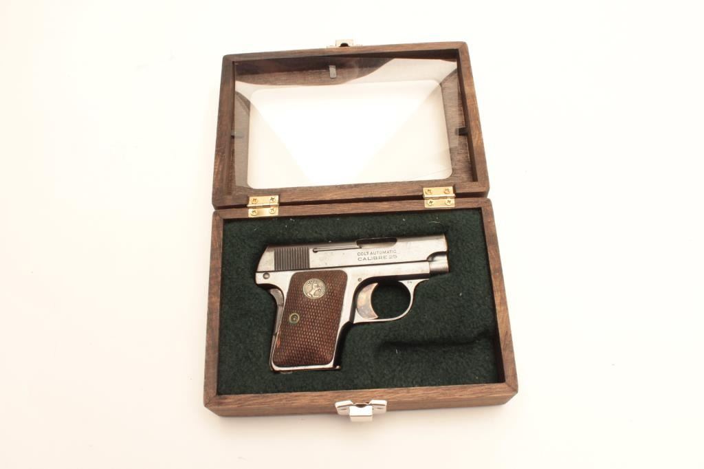Colt Model 1908 semi-auto pistol, .25 caliber, Serial #346871. The pistol is in very good overall condition with a 2” barrel. The pistol retains the majority of its blued finish with high point edge wear andsome loss of finish at the muzzle. The checkered wood medallion grips are in good condition with some flattening of the checkering and a small chip on the right panel. The bore is good, the action crispand markings are sharp. The pistol comes in a custom wooden box with one correct, Colt marked magazine. Est.: $150-$300. (C+R).