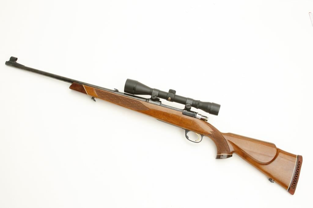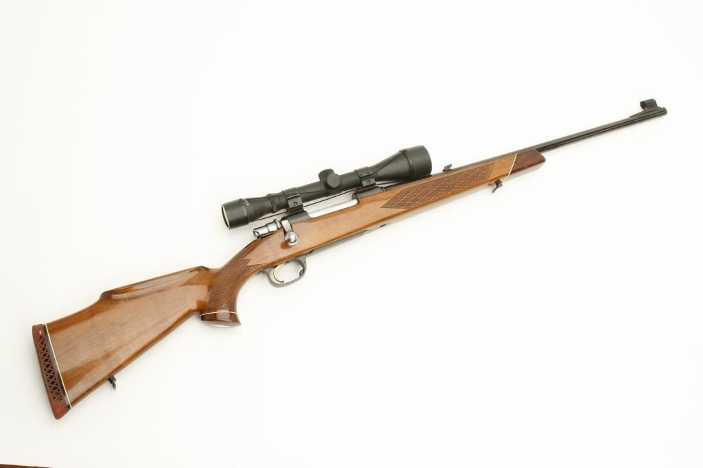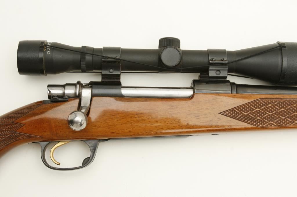 Parker Hale Mauser type bolt action rifle, .270 Win. caliber, 22.5” barrel, blued finish, checkered wood stock with added hard rubber butt pad, S/N Z-61879, in overall good to very good condition with a very goodbore, crisp action, sharp markings, very good wood stock that has a deteriorated butt pad (easily remedied); mounted with a Tasco 4 x 40 scope displaying sharp optics. (Modern/PPT). Est.: $450-$550.