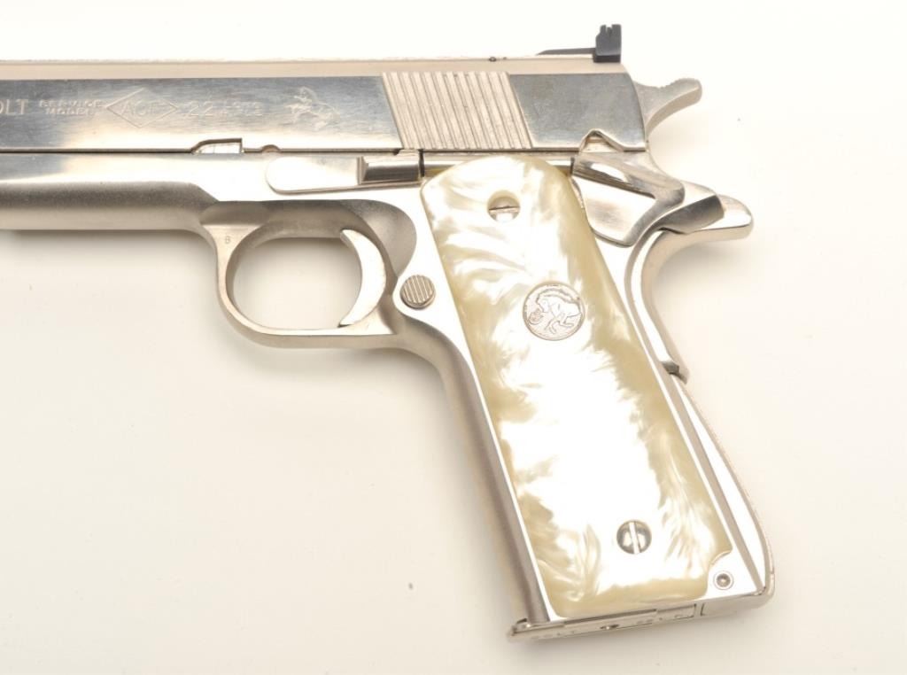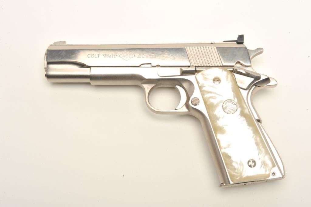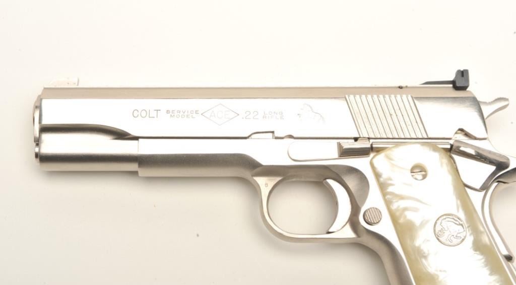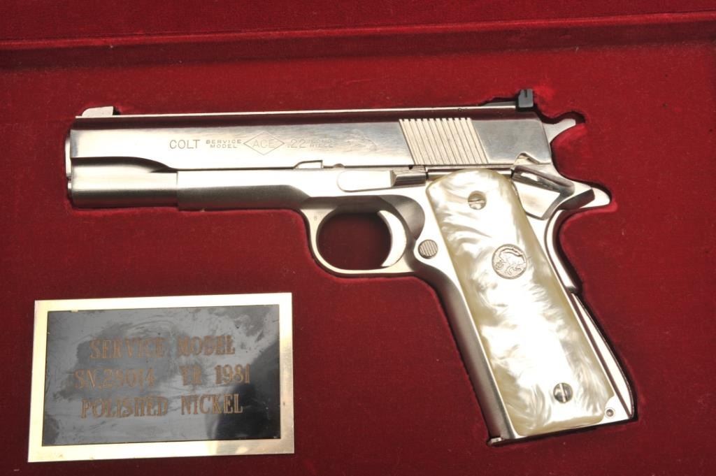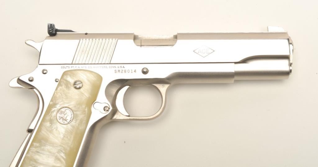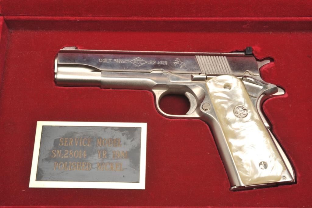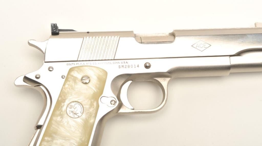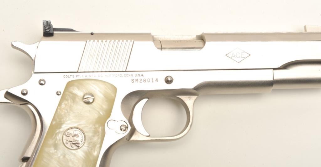 Colt Ace semi-automatic pistol, .22LR caliber, 5” barrel, polished nickel finish, faux pearl Colt medallion grips, S/N SM 28014, in overall fine condition with crisp action, sharp markings, very good + bore,fine grips. Note++ Excellent refinish-possibly factory or custom. Contained in a Colt wood presentation casing. (Modern/PPT). Est.: $1,500-3,000.