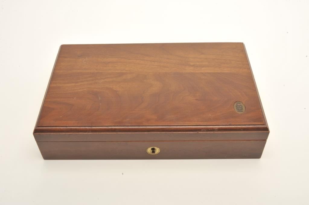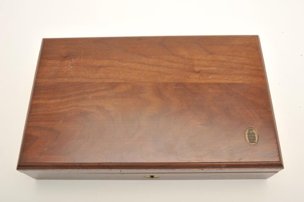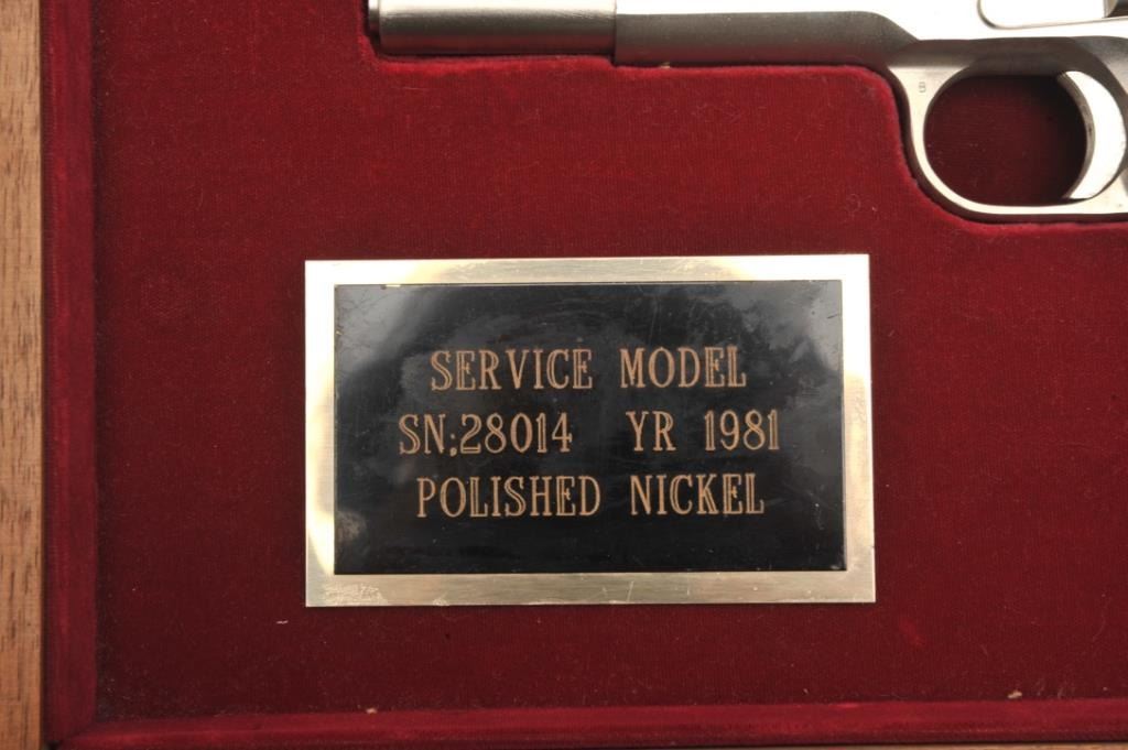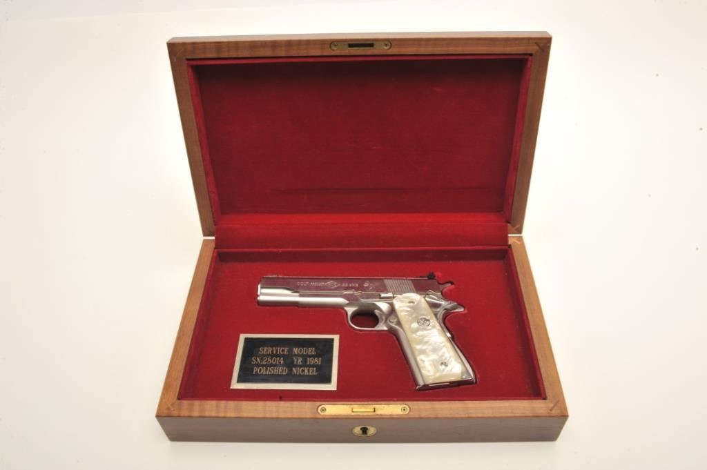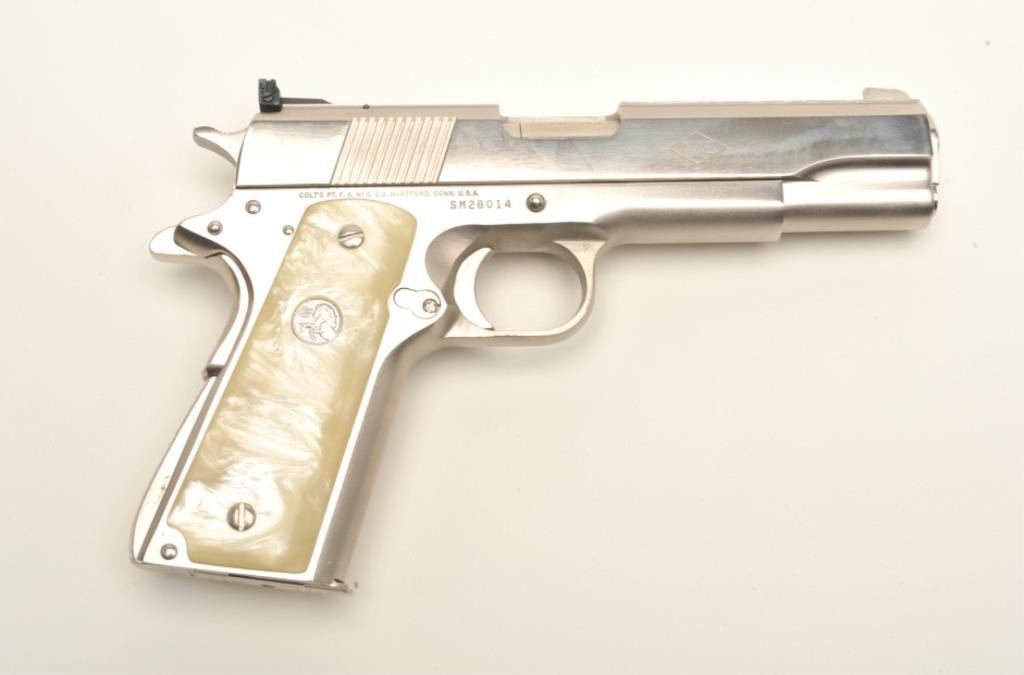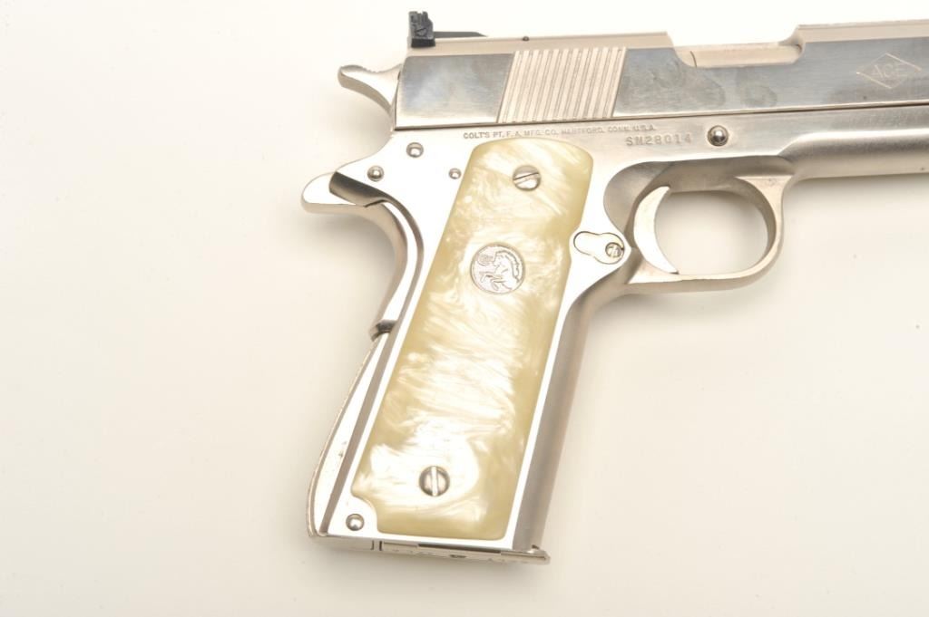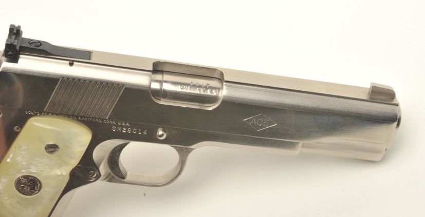 Colt Ace semi-automatic pistol, .22LR caliber, 5” barrel, polished nickel finish, faux pearl Colt medallion grips, S/N SM 28014, in overall fine condition with crisp action, sharp markings, very good + bore,fine grips. Note++ Excellent refinish-possibly factory or custom. Contained in a Colt wood presentation casing. (Modern/PPT). Est.: $1,500-3,000.