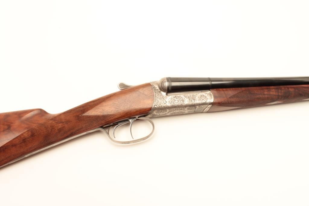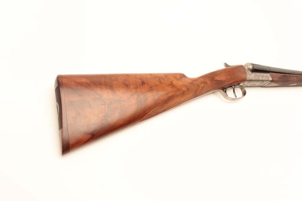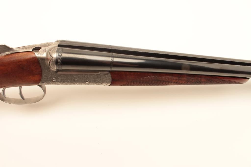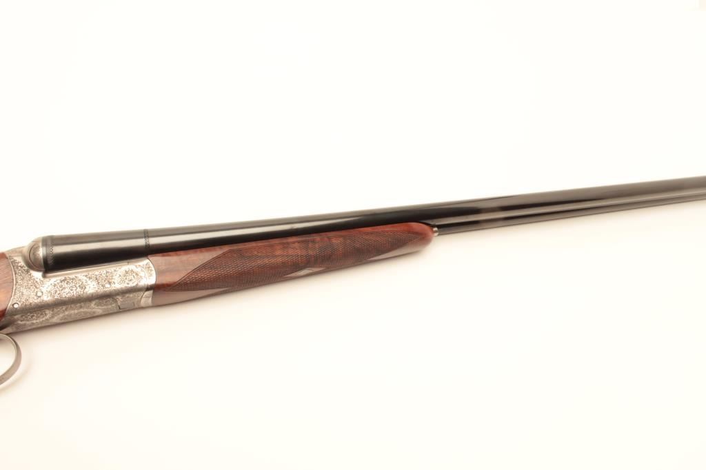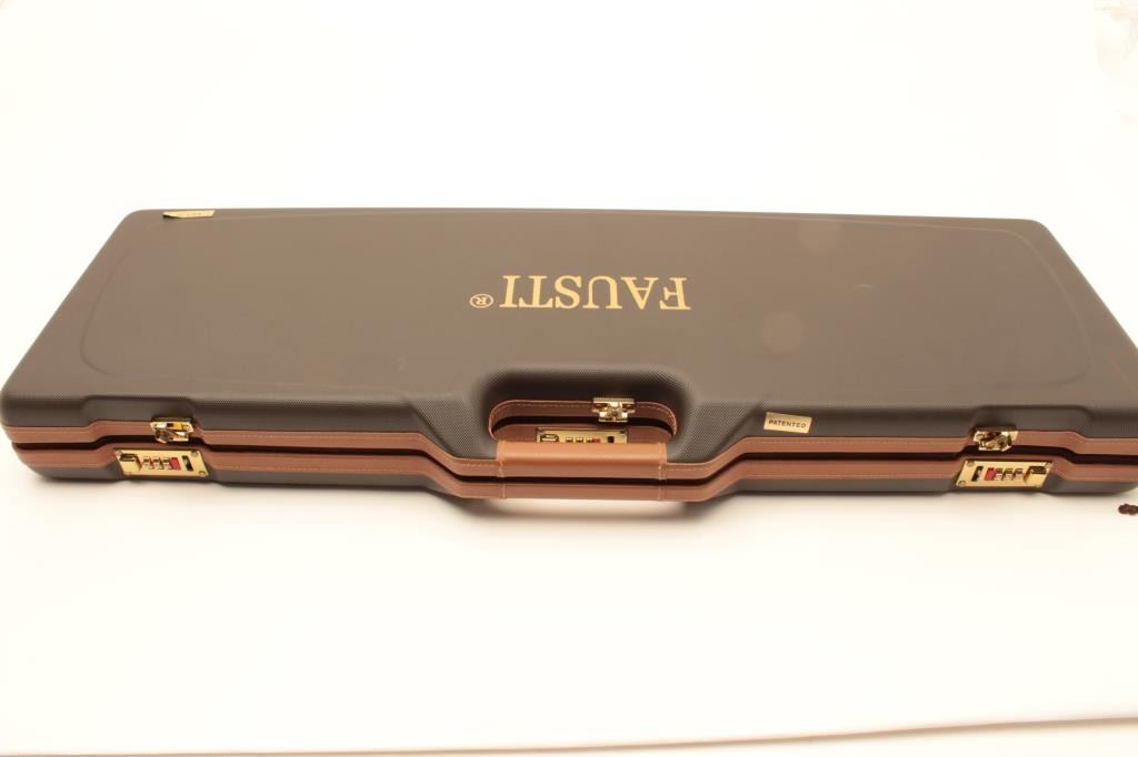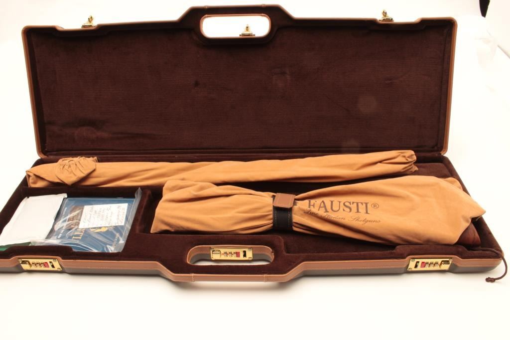 Beautiful Italian Fausti round body SxS hammerless shotgun, finely engraved receiver, 20 gauge, 28” barrels, double triggers, blued finish to barrels, deluxe checkered wood stocks, S/N B45994, in overall like newcondition in factory lined suitcase style hard case; original sale price: $3,754.99! (Modern/No PPT). Est.: $1,400-$2,800.