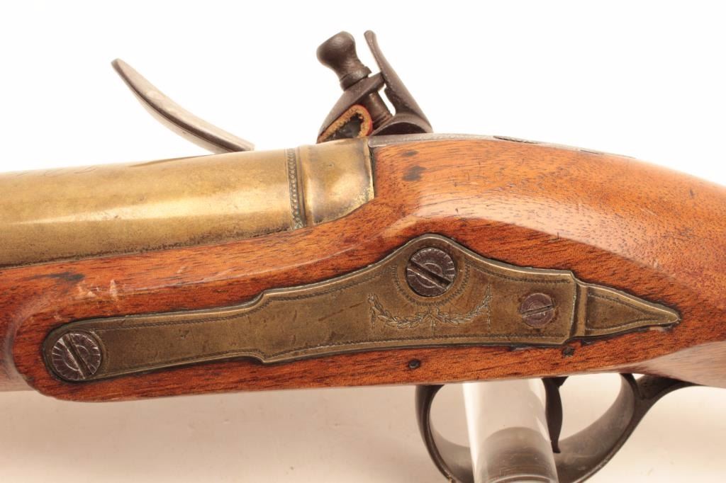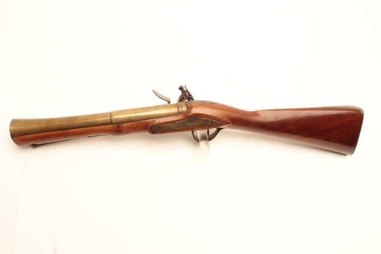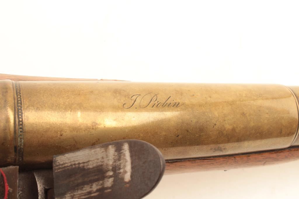 J. Probin flintlock blunderbuss, approximately 28.5” overall with a 13” brass barrel, wood stock, brass mounts, in overall very good to fine condition with crisp action and markings on both barrel and lockplate,very good to near fine stock with several old scratches and small mars from storage. (Antique). Est.: $2,000-$4,000.
