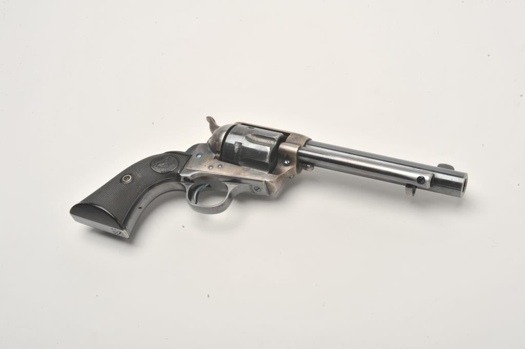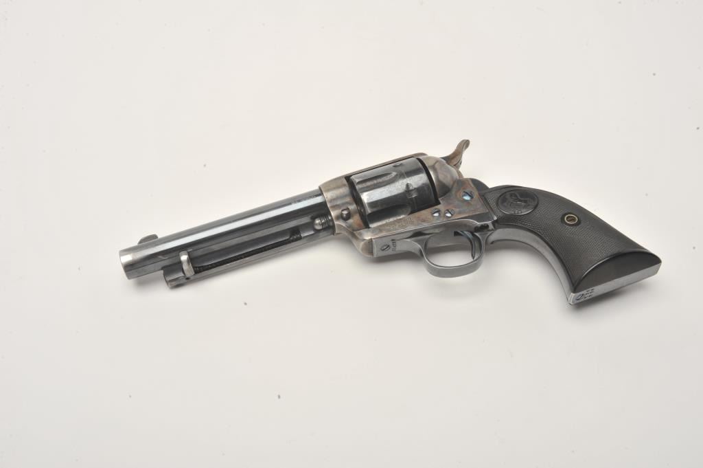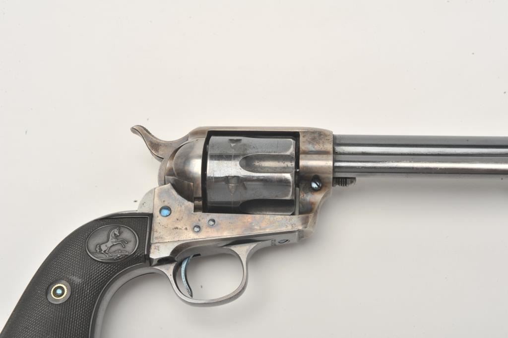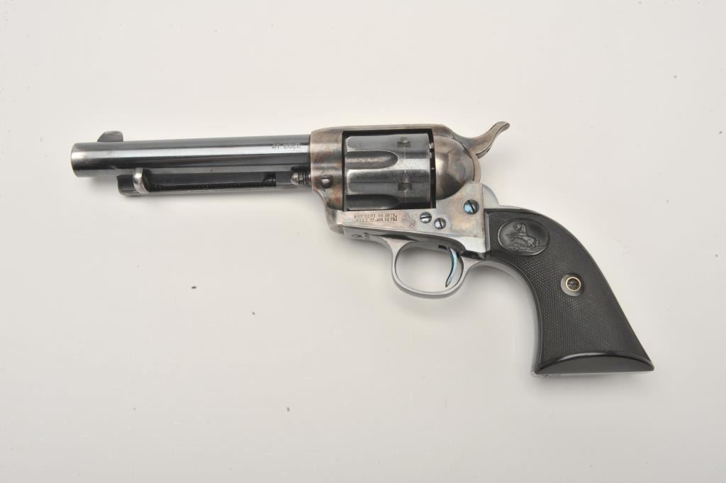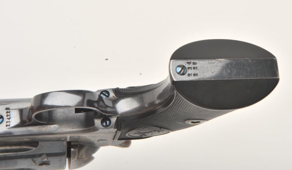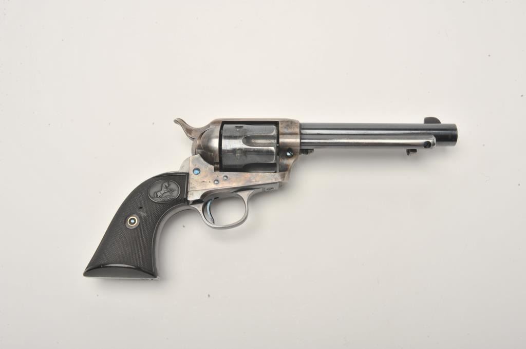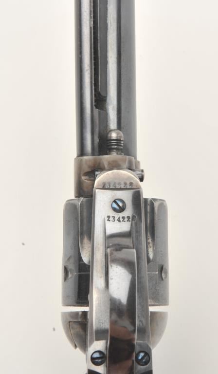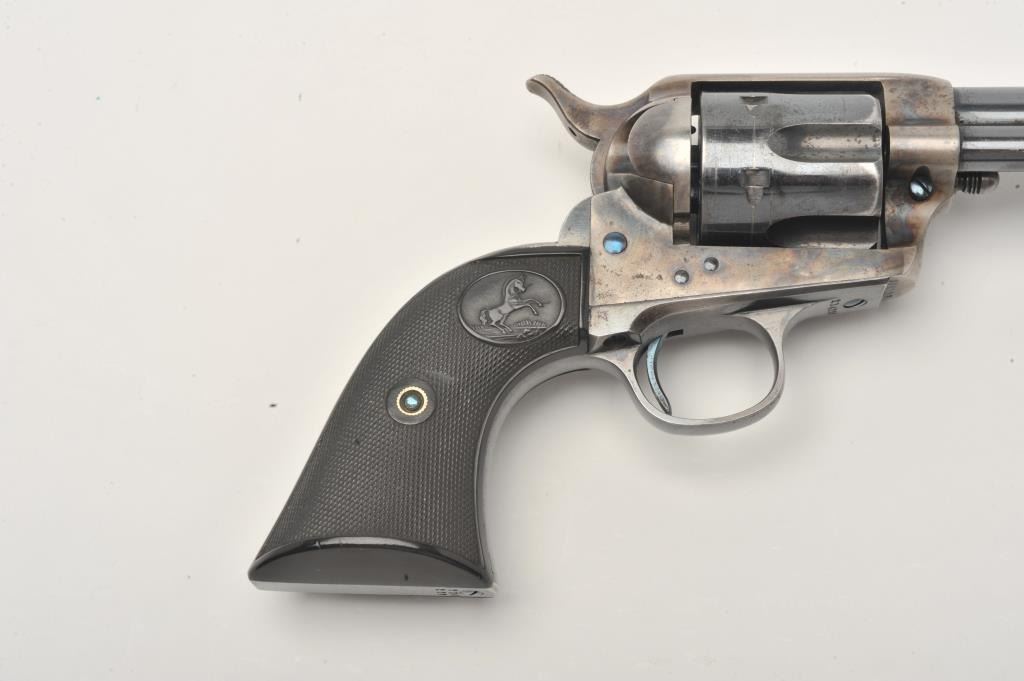 Colt SAA revolver, .41 caliber, 5.5” barrel, blued and case hardened finish, checkered hard rubber grips, S/N 234228, in overall fine condition showing the majority of its original blue and case colors, fine bore,action, markings and grips. Accompanied by a Colt factory letter confirming features (stocks “Not Listed”); shipped to Lee, Glass, Andreesen Hardware Co., Omaha, NE. on Oct. 21, 1902, nine guns in shipment.(C&R/No PPT). Est.: $2,500-$5,000.