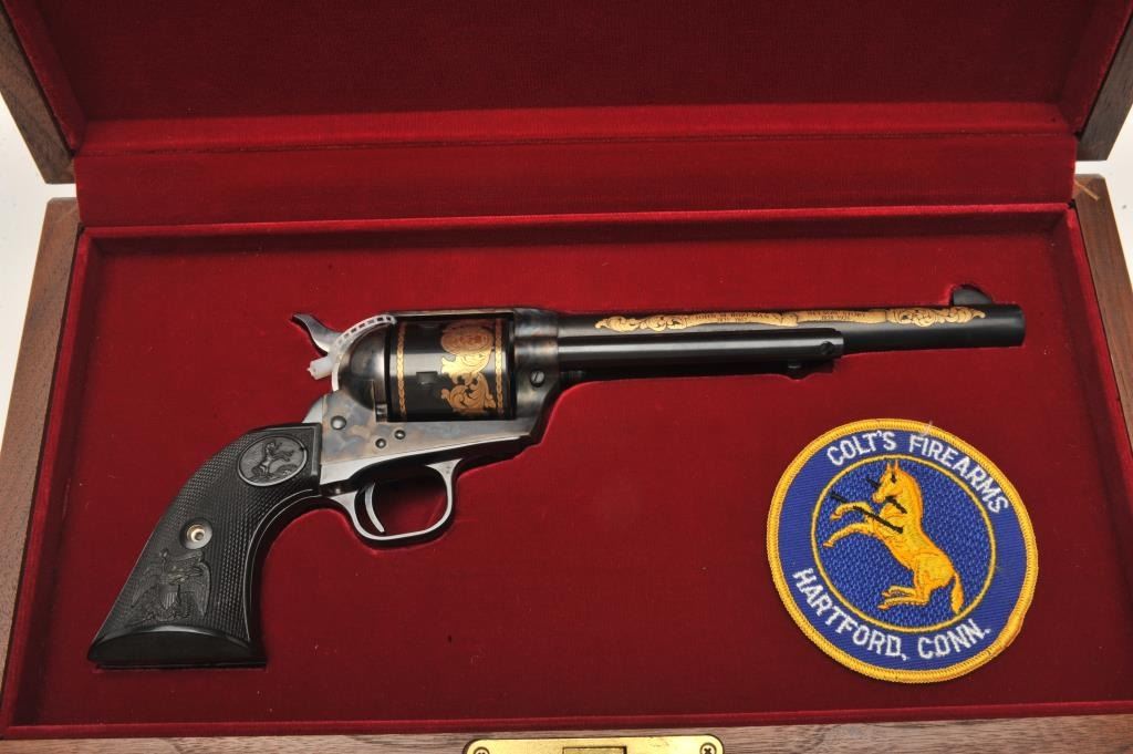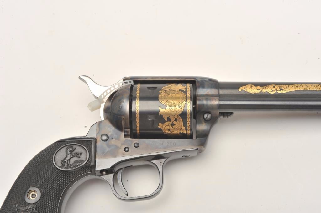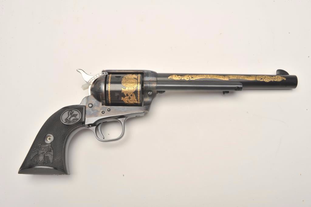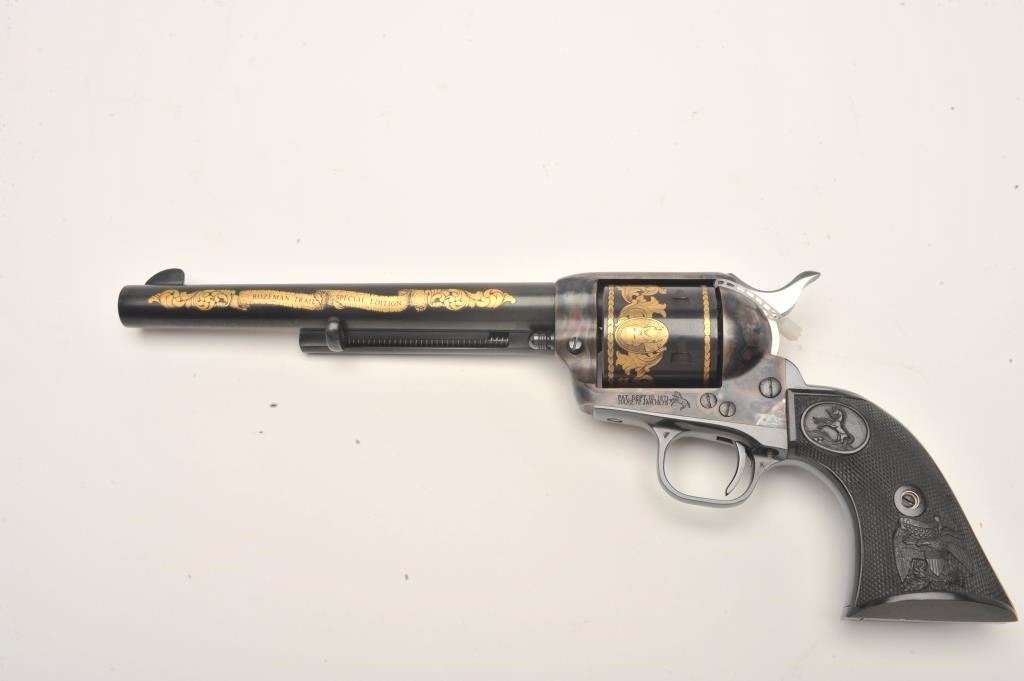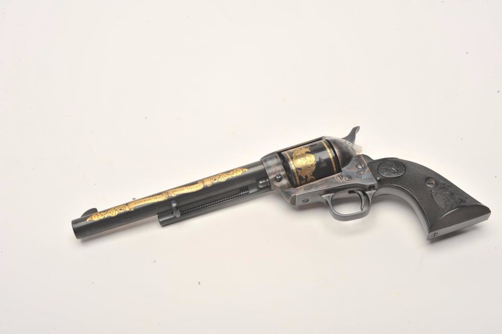 Colt SAA Commemorative Bozeman Trail Special Edition revolver in factory wood display case and Colt Custom Gun Shop wood grain cardboard box with correct end label numbered to this gun; .44/40 caliber, 7.5” barrel,blued and case hardened finish with gold decoration, checkered hard rubber eagle grips, S/N SA57728 (47 of 200 marked on end label); in overall like new condition with fine display case, instructions and hang tag. Also included is an article on this commemorative from the Bozeman Daily Chronicle of April 7, 1983, and other paperwork related to the history of this commemorative SAA. (C&R/No PPT).Est.: $1,250-$2,500.
