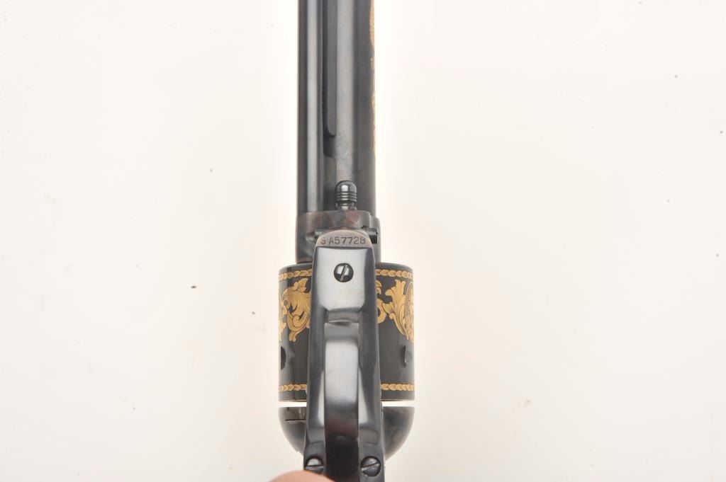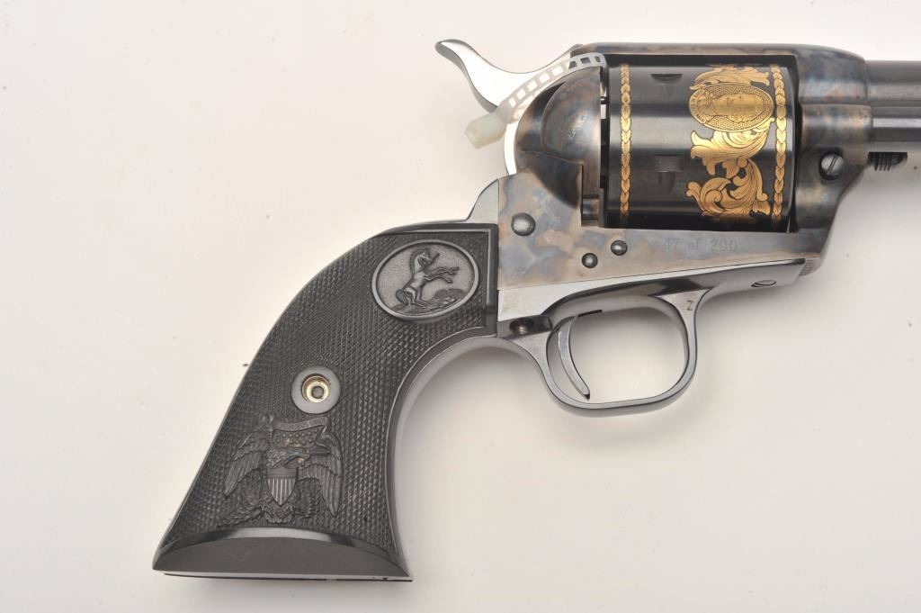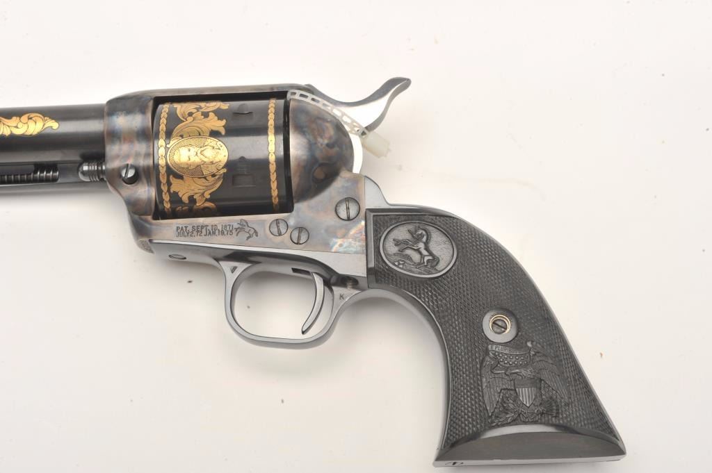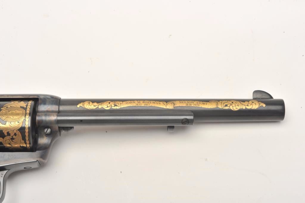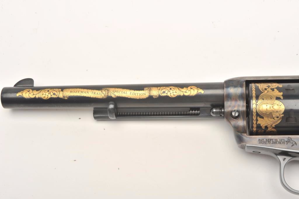 Colt SAA Commemorative Bozeman Trail Special Edition revolver in factory wood display case and Colt Custom Gun Shop wood grain cardboard box with correct end label numbered to this gun; .44/40 caliber, 7.5” barrel,blued and case hardened finish with gold decoration, checkered hard rubber eagle grips, S/N SA57728 (47 of 200 marked on end label); in overall like new condition with fine display case, instructions and hang tag. Also included is an article on this commemorative from the Bozeman Daily Chronicle of April 7, 1983, and other paperwork related to the history of this commemorative SAA. (C&R/No PPT).Est.: $1,250-$2,500.