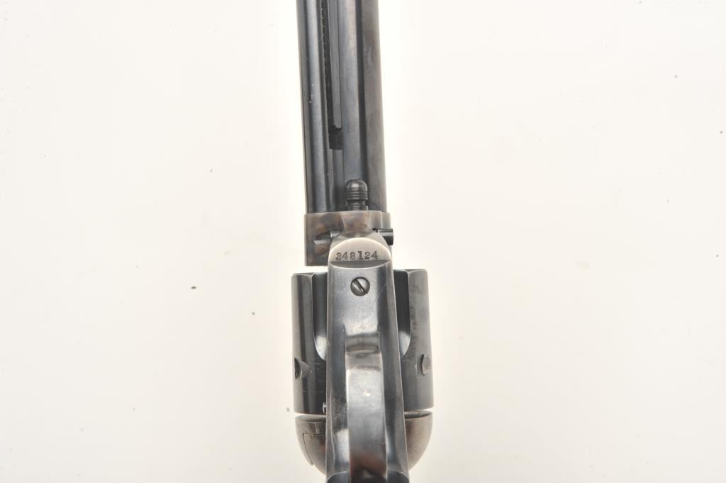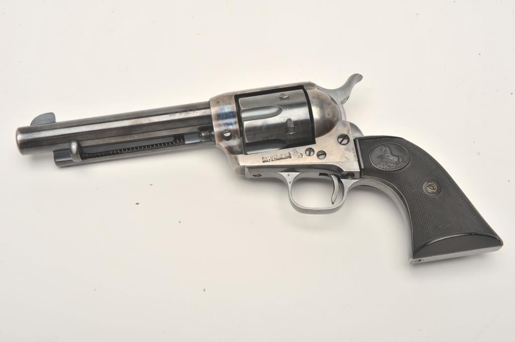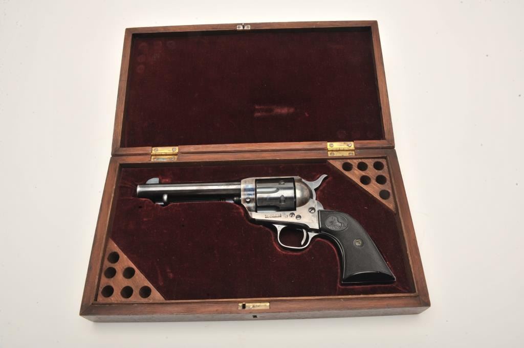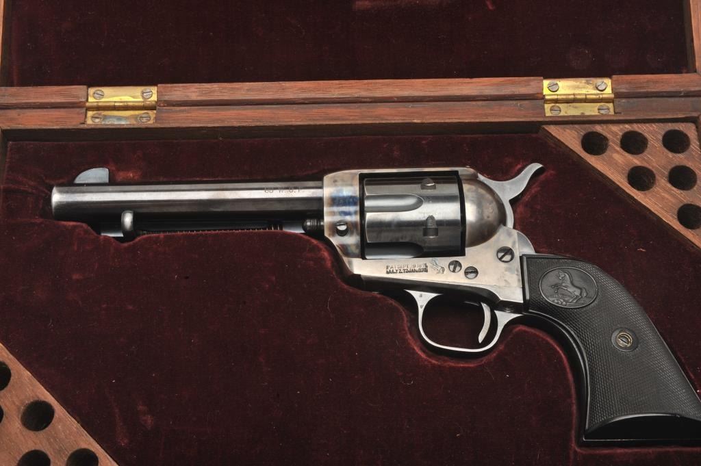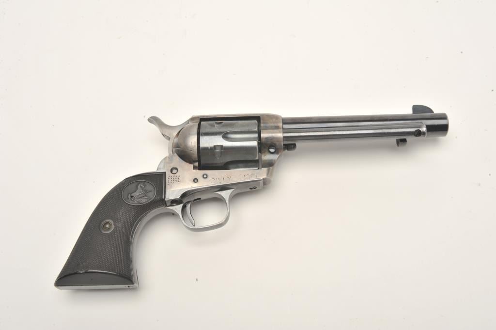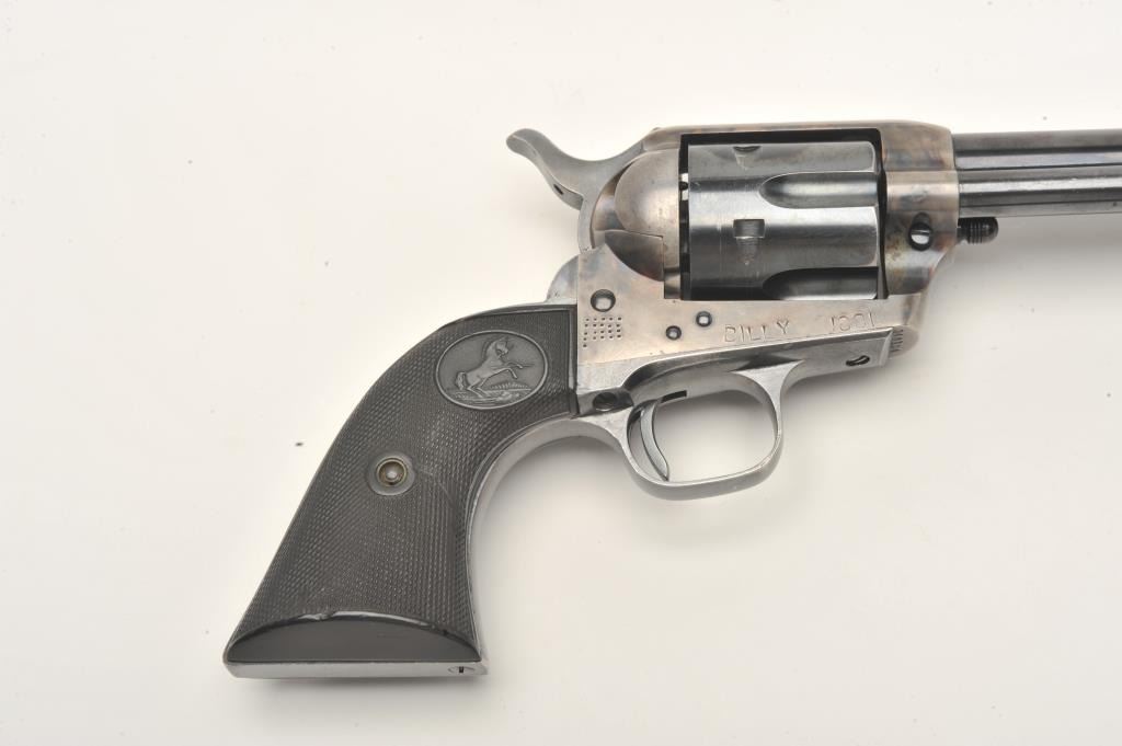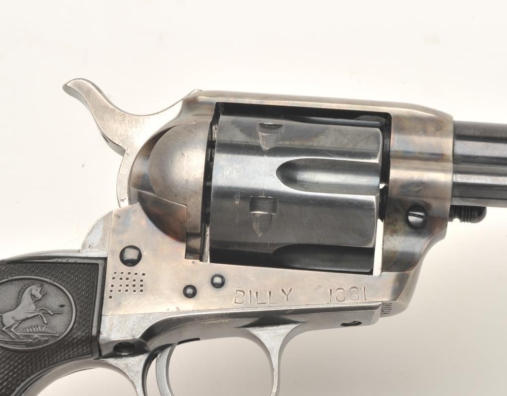 Colt SAA revolver, .38 W.C.F. caliber, 5.5” barrel, blued and case hardened finish, checkered hard rubber grips, S/N 348124, in overall fine to excellent condition showing the majority of its blued finish with vividoriginal case colors on front of frame, fine bore, action and grips; sharp markings plus interesting stamping on bottom right side of frame “BILLY 1881” plus dot matrix. Accompanied by a Colt factory letterconfirming features and noting shipment to Wm. H. Hoegee Co., Los Angeles, CA on November 14, 1925, one gun in shipment. Accompanied by older wooden display case. Interesting Colt as one gun shipment to LosAngeles dealer and stamping on frame; possible early movie use?? (C&R/No PPT). Est.: $2,000-$4,000.