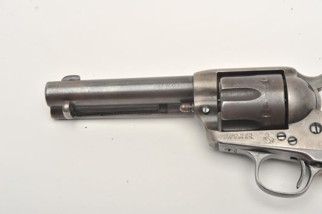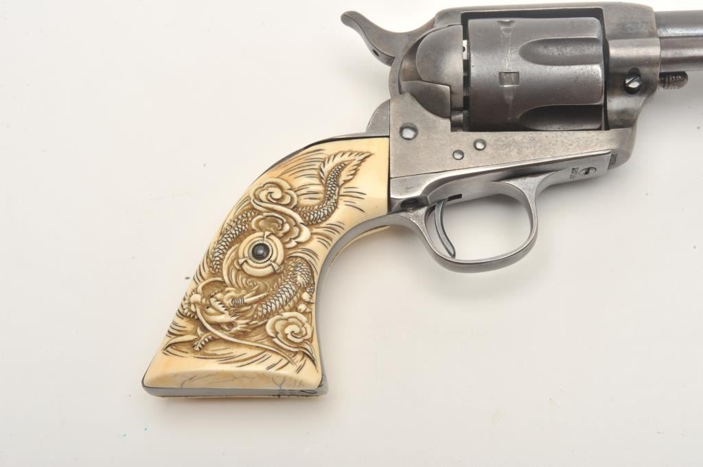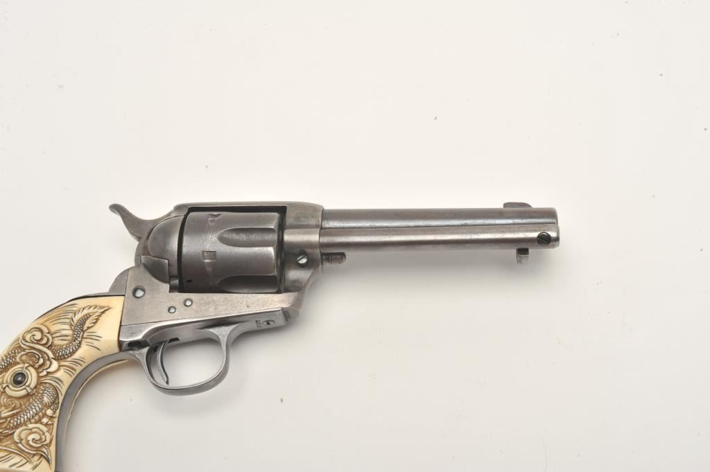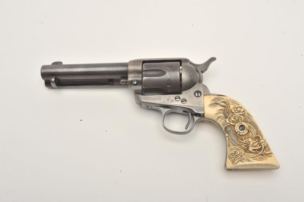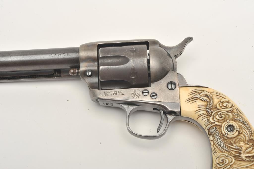 Colt SAA revolver, .32 W.C.F. caliber, 4.75” barrel, blued finish, old raised carved ivory grips, S/N 260788, in overall good to very good condition with a dark patina, traces of original case colors on the frame, crispaction, overall good bore, sharp markings and beautifully carved grips. Accompanied by a Colt factory letter confirming features (stocks “Not Listed”), shipped to A. Baldwin & Co., New Orleans, Louisiana on Nov. 15,1904, five guns in shipment. (C&R/No PPT). Est.: $1,000-$2,000.