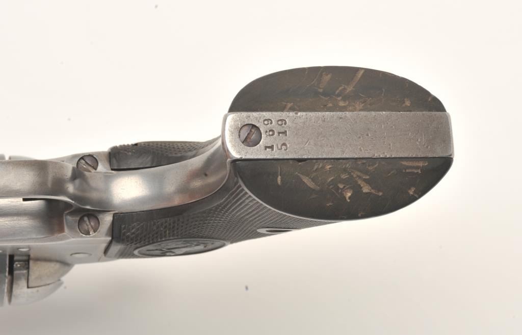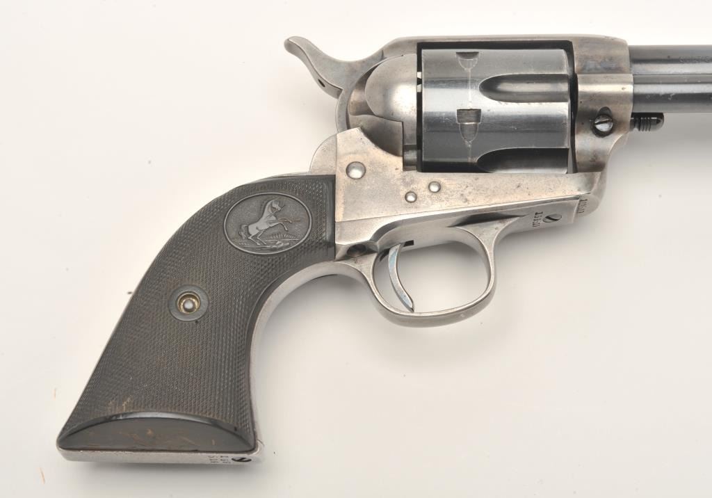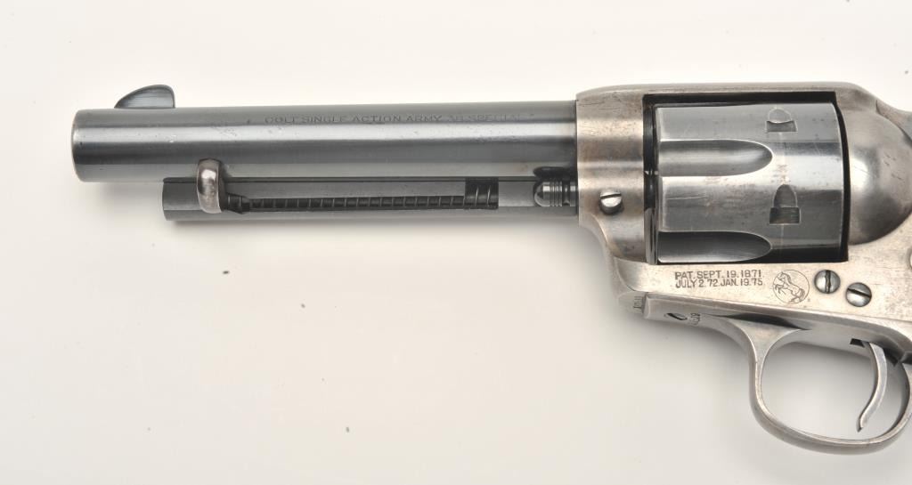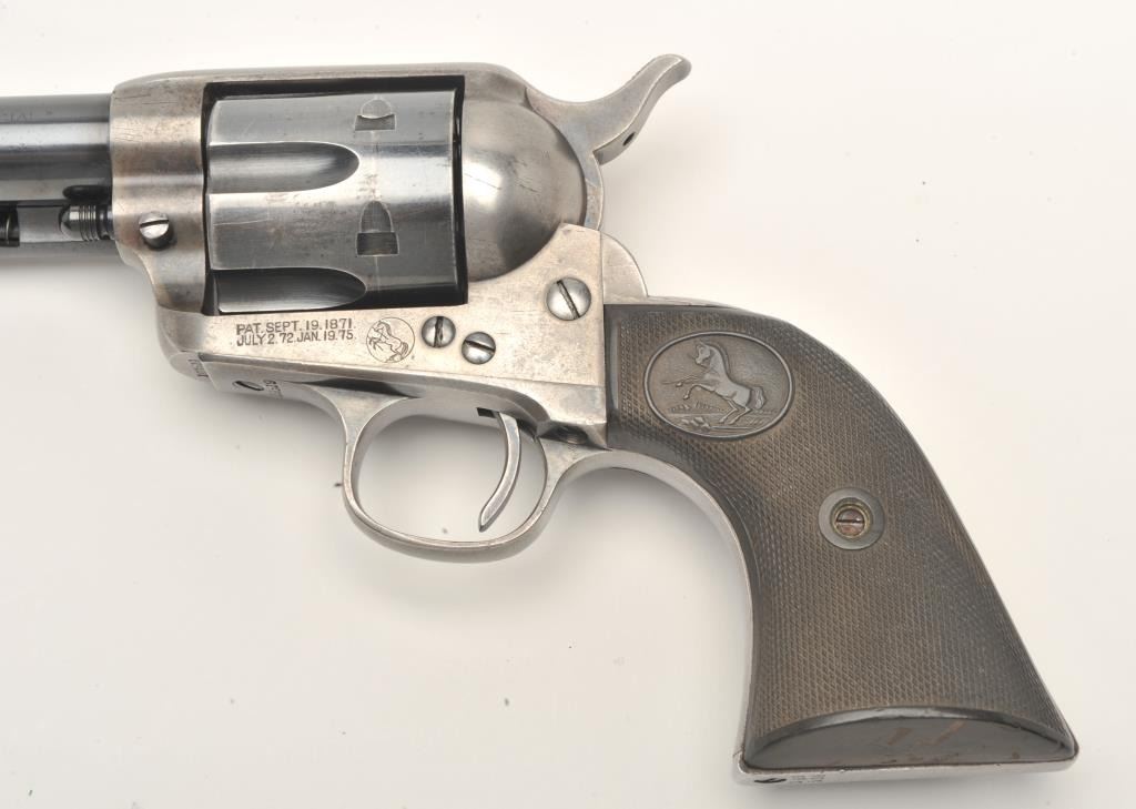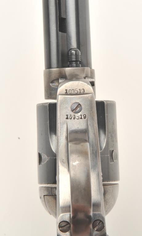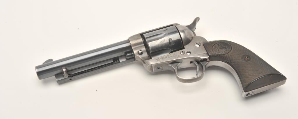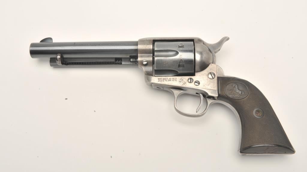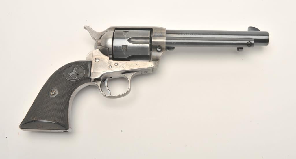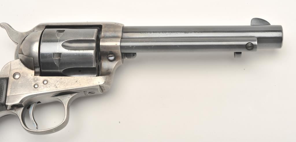 Colt SAA revolver, re-barreled to .38 Special caliber, 5.5” barrel, blued and case hardened finish, checkered hard rubber grips, S/N 169519, in overall good to very good condition as re-worked; crisp action, verygood bore, sharp markings and good to very good grips. Accompanied by a Colt factory letter indicating originally .32/20 caliber, 4.75” barrel, hard rubber grips and blued finish, shipped to Simmons Hardware Co., St.Louis, MO. on March 1, 1897, ten guns in shipment. (Antique). Est.: $1,200-$2,400.