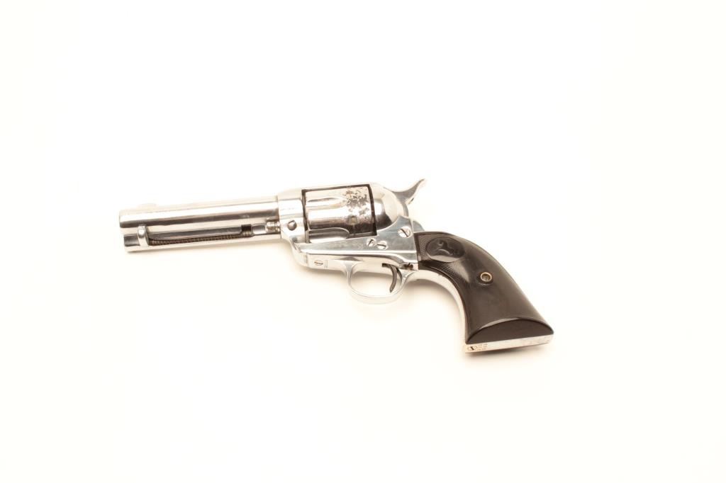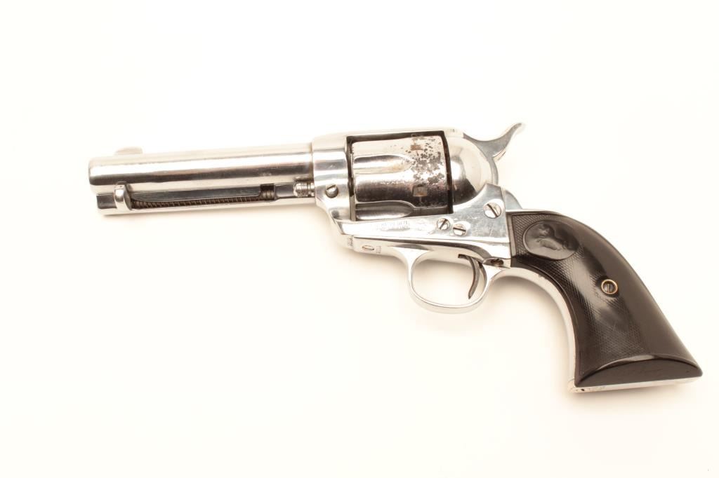 Colt SAA revolver, .41 caliber, 4.75” barrel, re-nickel finish, checkered hard rubber grips, S/N 265502, with factory letter confirming caliber and barrel length, stocks “Not Listed”, shipped to Belknap Hardware &Mfg. Co., Louisville, KY on May 1, 1905, five guns in shipment; in overall good condition showing the majority of an old re-nickel (factory letter states the gun left the factory blued) with some flaking of finish on the cylinder; crisp action, fair bore, overall good grips. (C&R/No PPT). Est.: $1,000-$2,000.