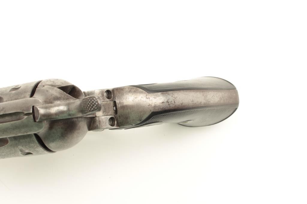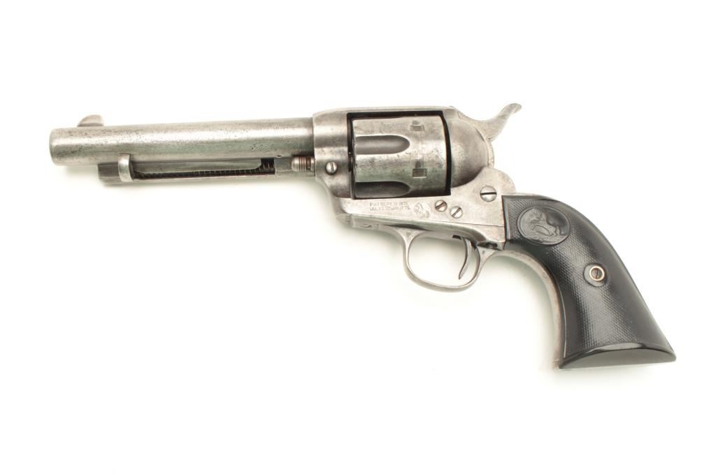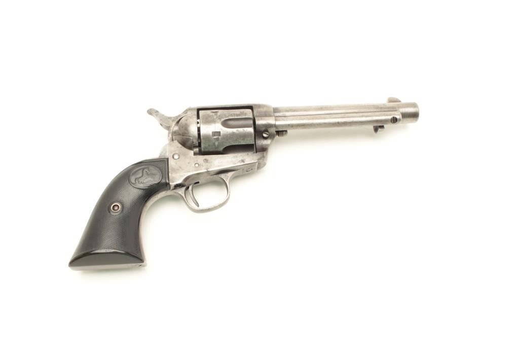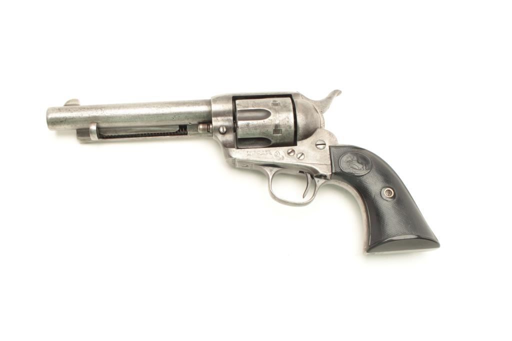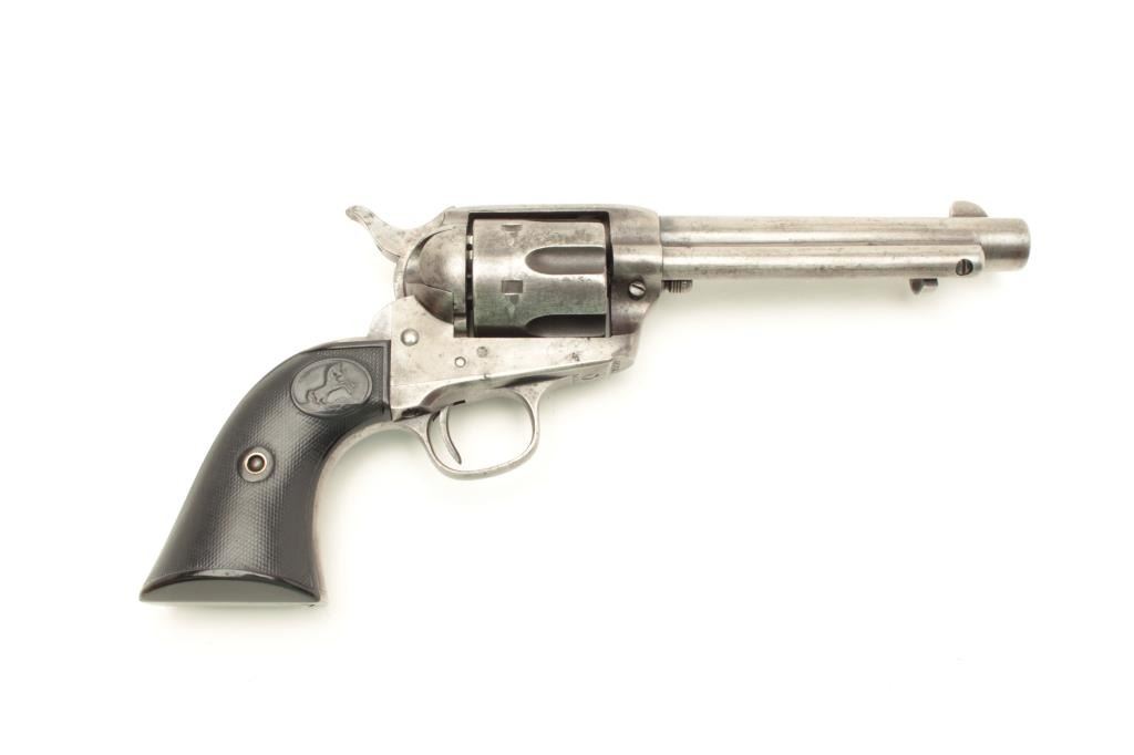 Colt SAA revolver, .38/40 caliber, 5.5” barrel, blued finish, checkered hard rubber grips, S/N 301811, in overall very good condition showing a grey patina to metal surfaces with scattered pinprick pitting andsome areas of erosion, good bore, crisp action, good markings and very good grips. Accompanied by a Colt factory letter confirming caliber, barrel length and finish, type of stocks “Not Listed”; sold toWinchester Repeating Arms Co. in New Haven, CT. and shipped to Strevell-Paterson Hardware Co. in Salt Lake City, Utah on December 31, 1907. Would be interesting to further research Strevell-Paterson Hardware and itsassociation with Winchester during this 1907 time period. (C&R/No PPT). Est.: $1,500-$3,000.
