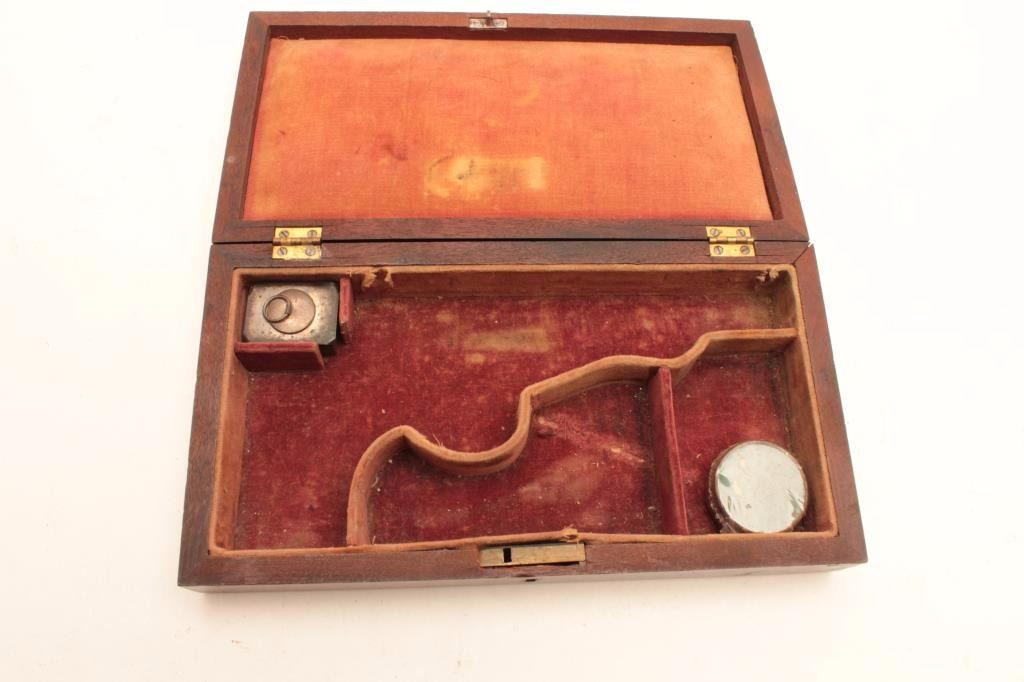 Original 19th century case for American revolver of percussion era, ca. 1850s-60s; smaller than ’49 Pocket Model with approximately 4” barrel and 8.5’ overall. Red velveteen lining; silvered oil containerof tin with percussion caps; walnut exterior; very good condition; possibly for a Bacon or IXL, etc. Est.: $350-$700.