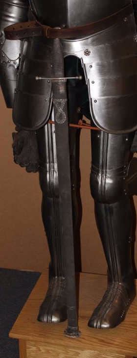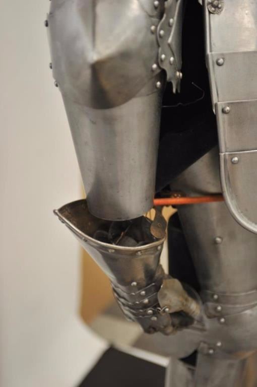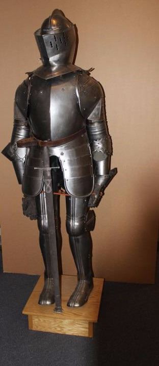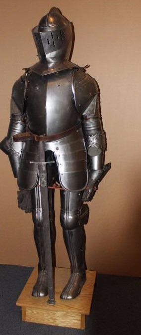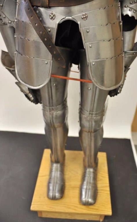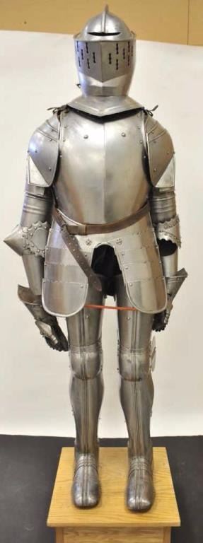 Early to mid-20th century fully articulated suit of armor probably English made to decorate castles or manors. Approximately 68” in height not including wood base. Great arm and leg defenses with fully articulatedfingers and leather gloves. The condition is very good as recently cleaned and mounted. The helmet is a bit later than the body and not quite as fine quality. Est.: $1500-3000