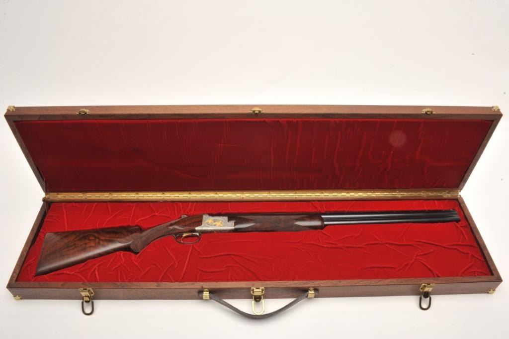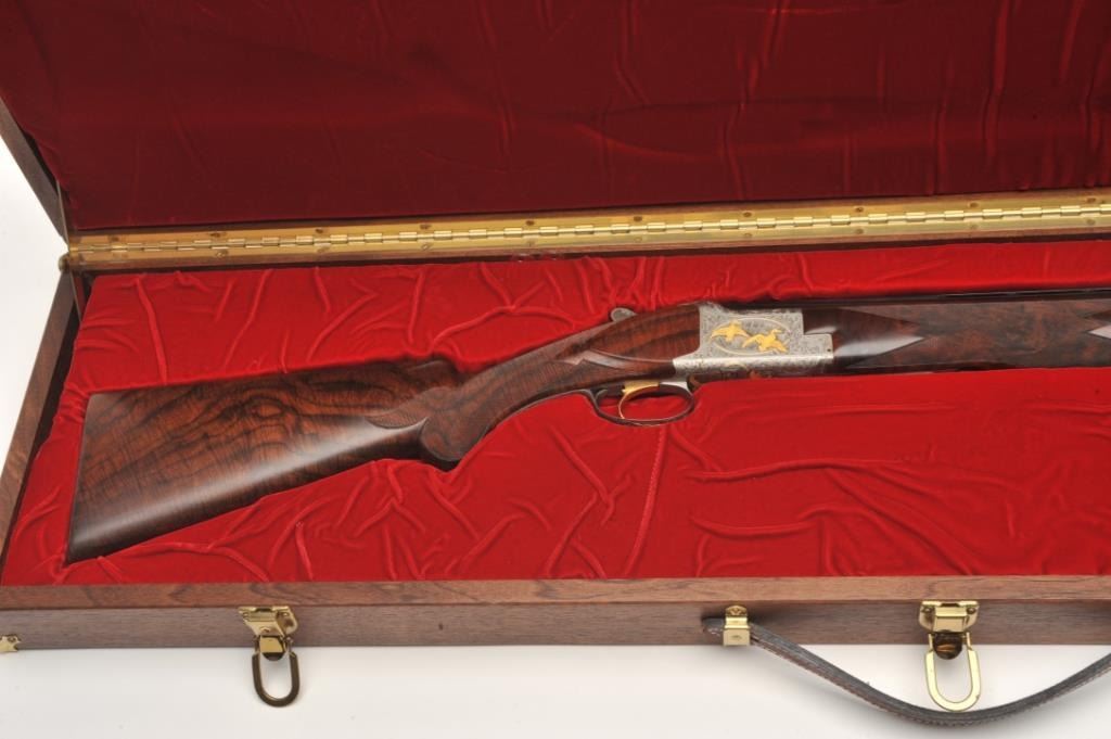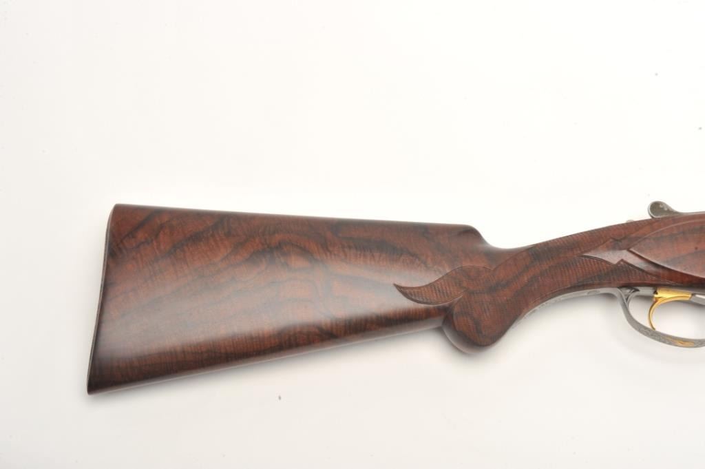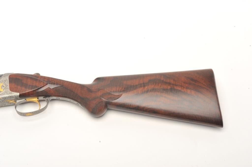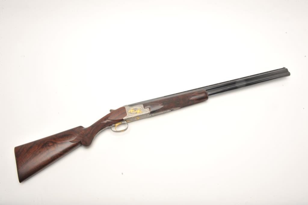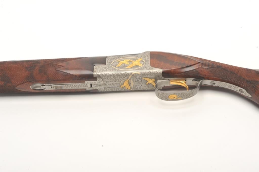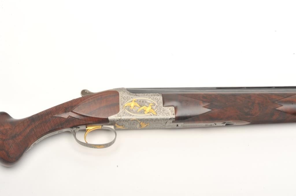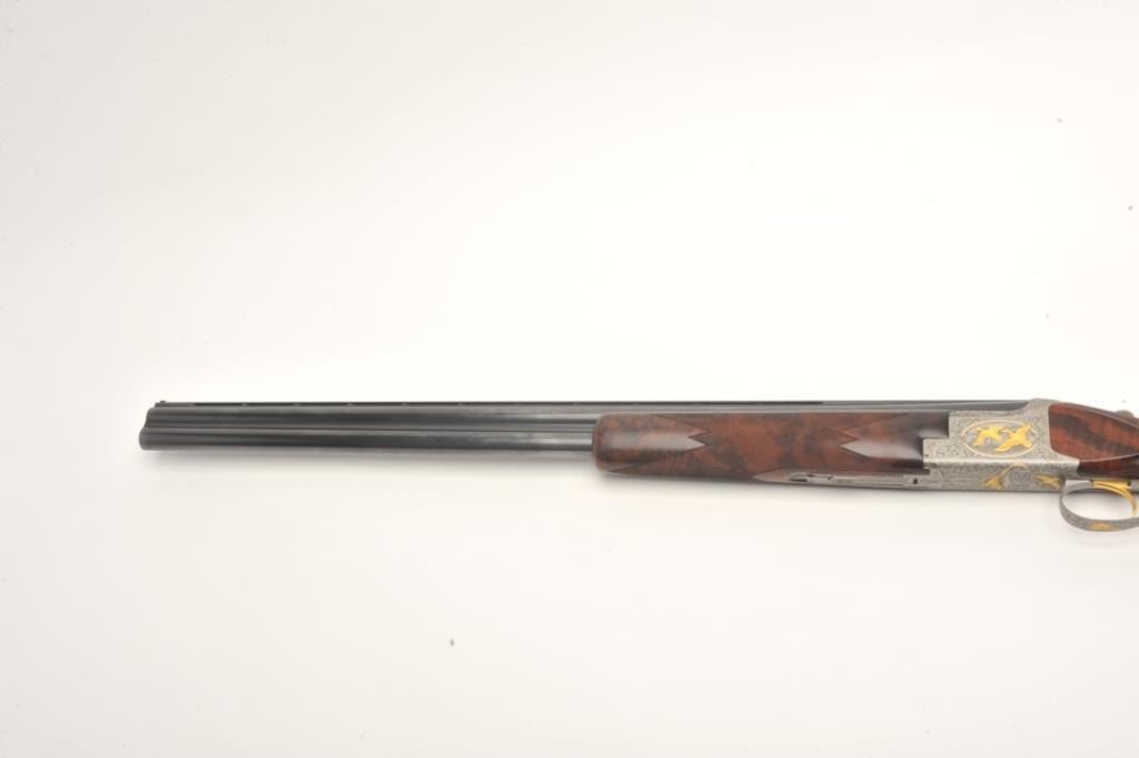 Browning Superposed High Grade Black Duck Model O/U shotgun, 12 gauge, serial #8J4PY00086. This shotgun, along with the two prior lots, comprises three matched examples of the Browning WaterfowlSuperposed Series. According to the consignor, only 13 Waterfowl sets with matching serial numbers were produced. This high grade, Belgian made Browning is as new in the box with 28” barrels featuring a full-length ventilatedrib and ivory bead front sight. The upper barrel is modified choke while the lower is full choke. The shotgun barrels retain nearly all of their blued finish with only the lightest ofhandling marks. The coinfinished, relief engraved receiver is finished in the white with gold inlayed game scenes on both sides depicting Black Ducks. The underside of the action is marked 086 of 500 in gold,indicating the limitedproduction of the series. The shotgun comes in the original box with all associated paperwork and manuals. The finely checkered wood stocks are in excellent condition with beautiful, Note+++3rd in a 3 part series, 1st is lot 825a, 2nd is lot 825b.