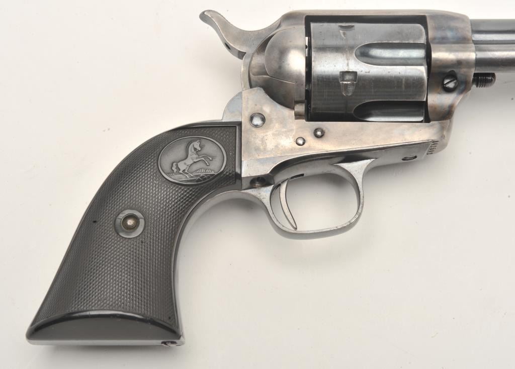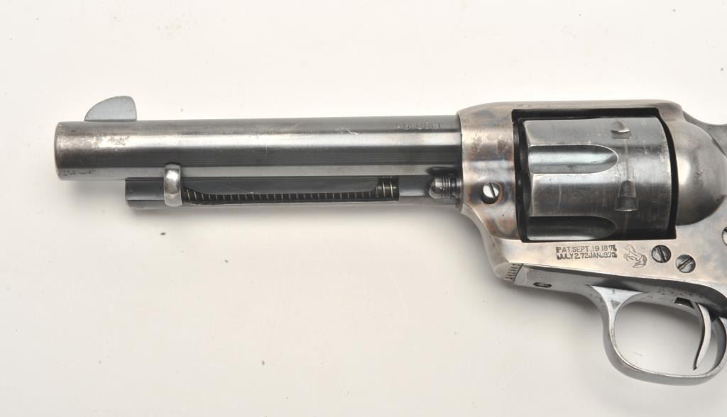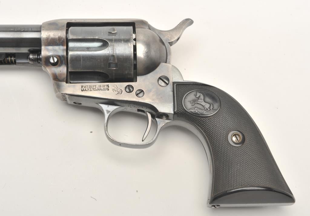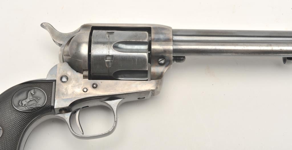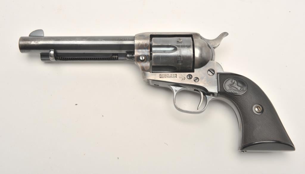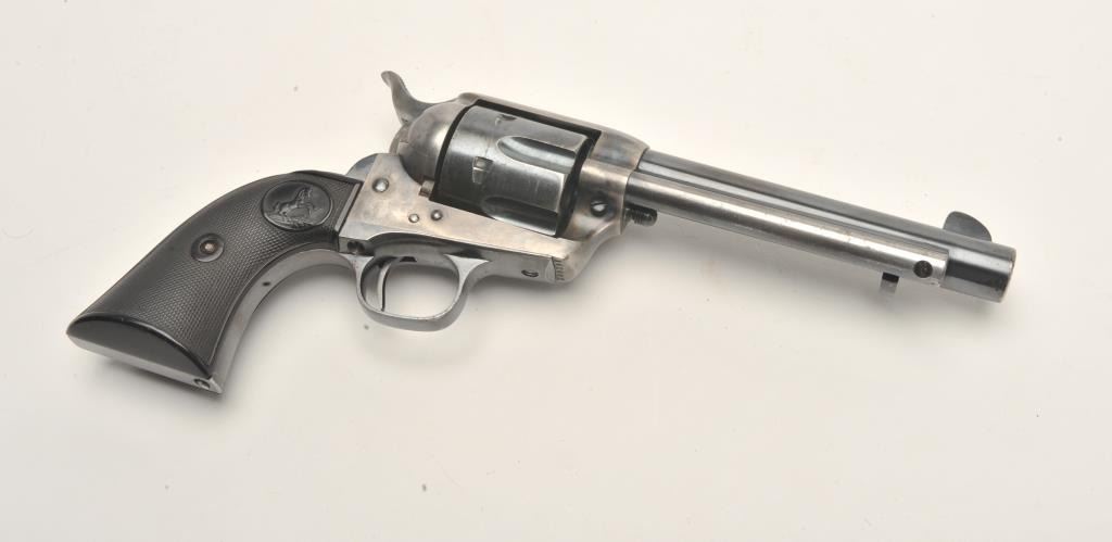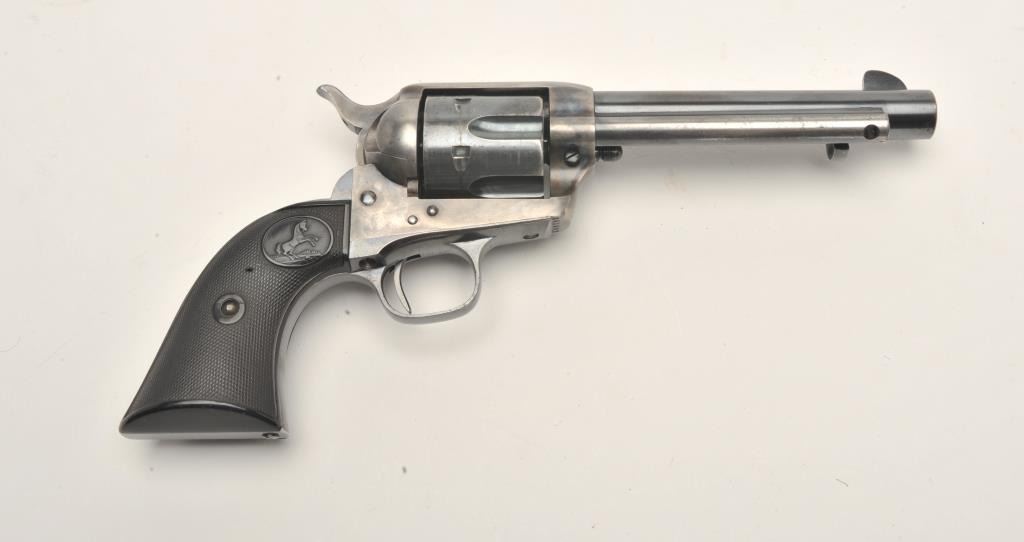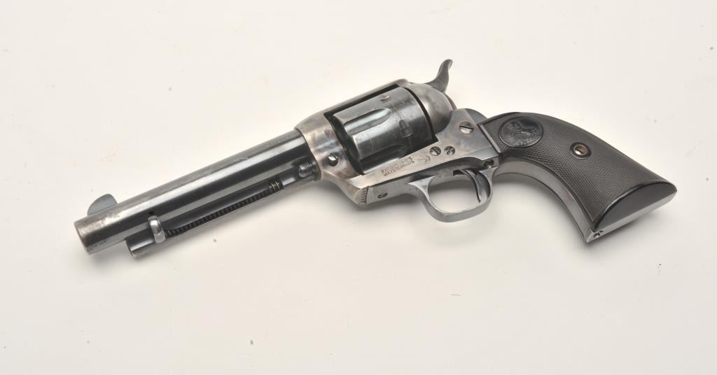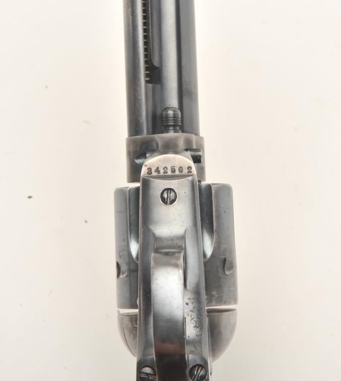 Colt SAA revolver, .45 caliber, 5.5” barrel, blued and case hardened finish, checkered hard rubber grips, S/N 342502, in overall fine to excellent condition displaying the majority of its original blue and casecolors, fine bore, crisp action, sharp markings and fine grips; accompanied by a Colt factory letter confirming features (stocks “Not Listed) with shipment to Harper and Reynolds Co., Los Angeles, CA. on Feb.15, 1922, two guns in shipment. (C&R/No PPT). Est.: $1,750-$3,500.