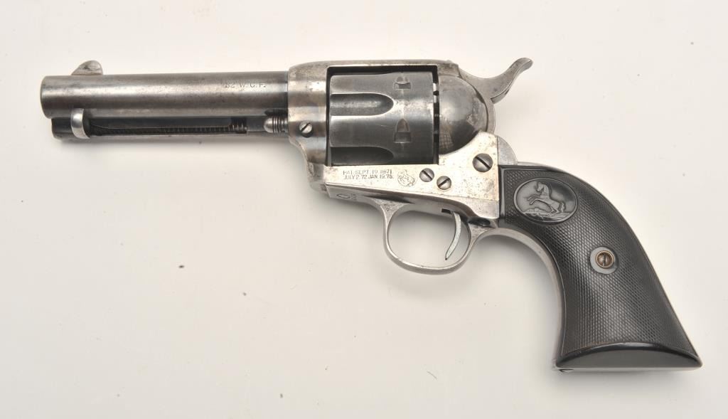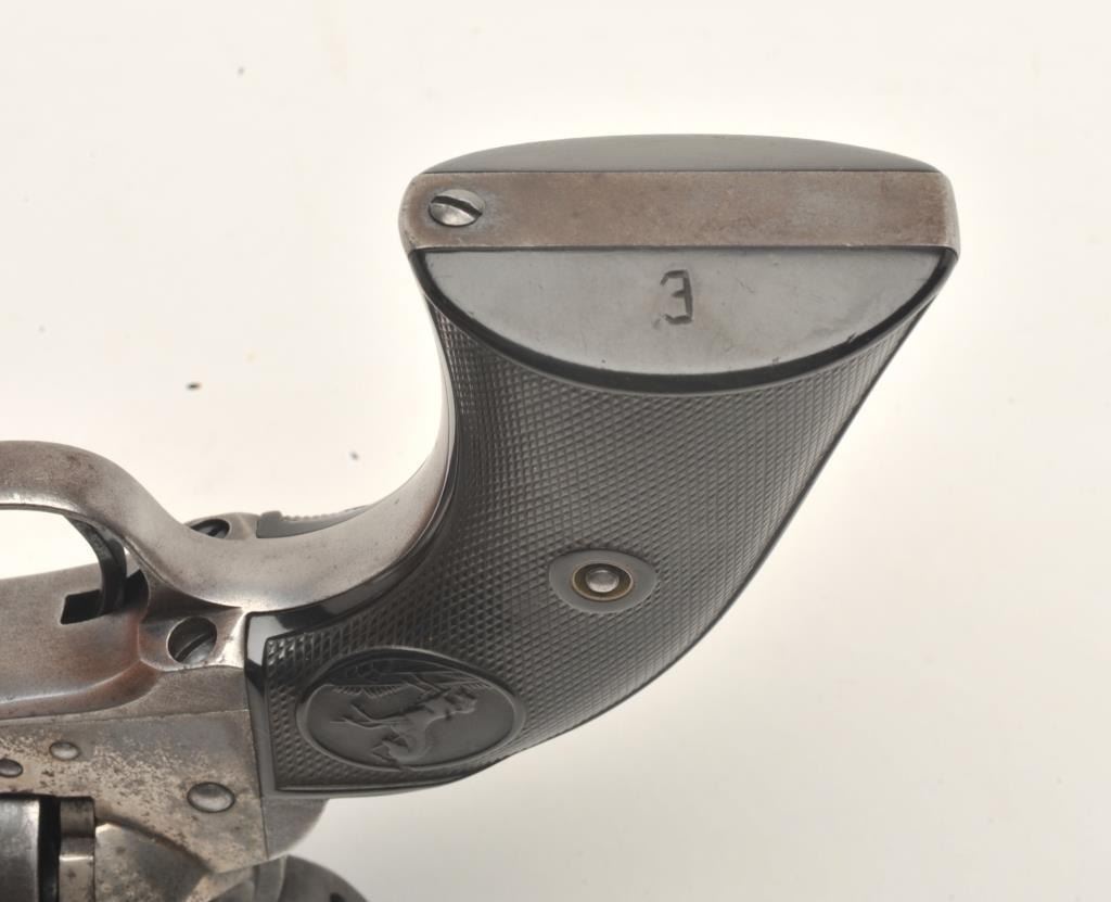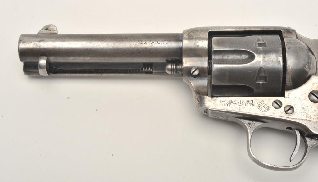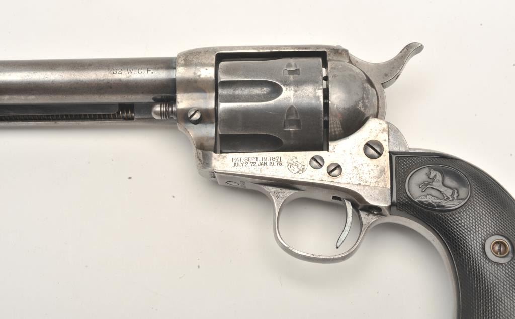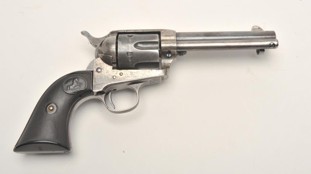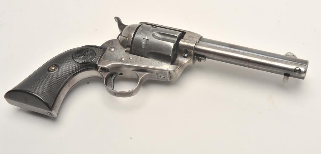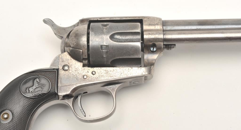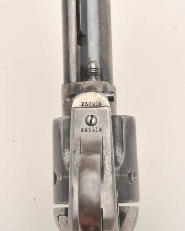 Colt SAA revolver, .32/20 caliber, 4.75” barrel, blued and case hardened finish, checkered hard rubber grips, S/N 263916, in overall very good + condition displaying traces of original blue and case colors inprotected areas, crisp action, very good bore, sharp markings and very good grips; A very good Colt factory letter accompanies this gun confirming features (stocks “Not Listed”) and importantly, sold to BiddlePurchg. Co., address unavailable with shipment to the Anaconda Copper Mining Co., Butte, MT. on February 17, 1905, two guns in shipment. (C&R/No PPT). Est.: $1,750-$3,500.