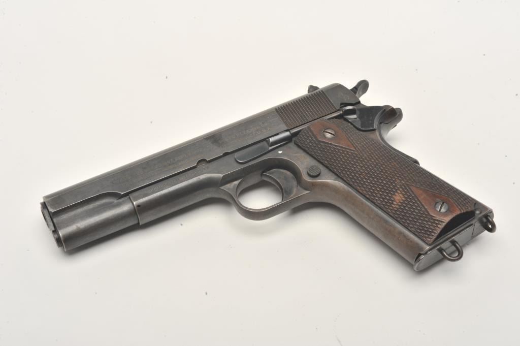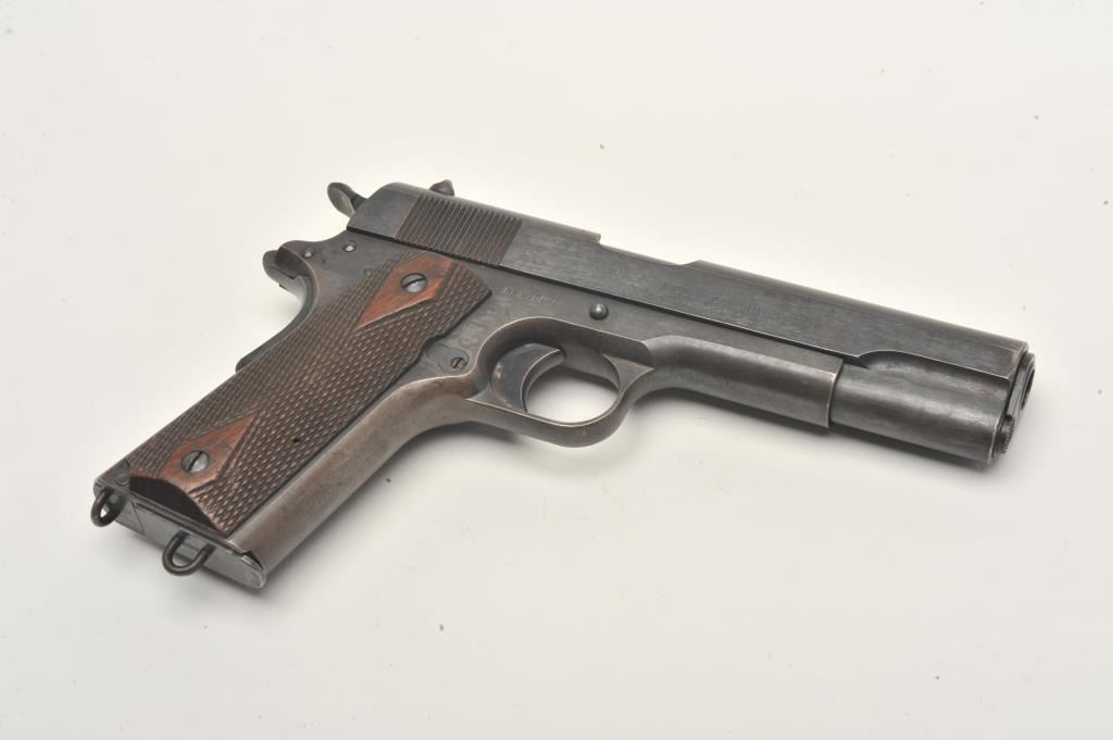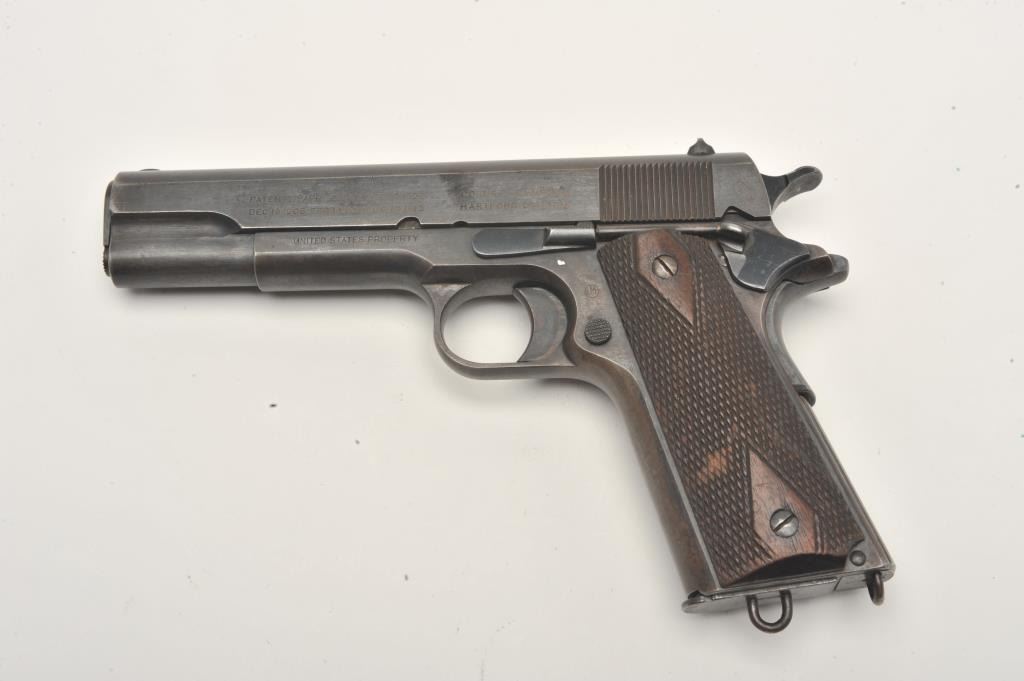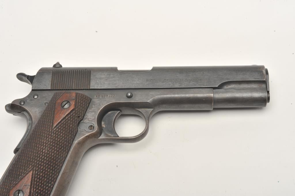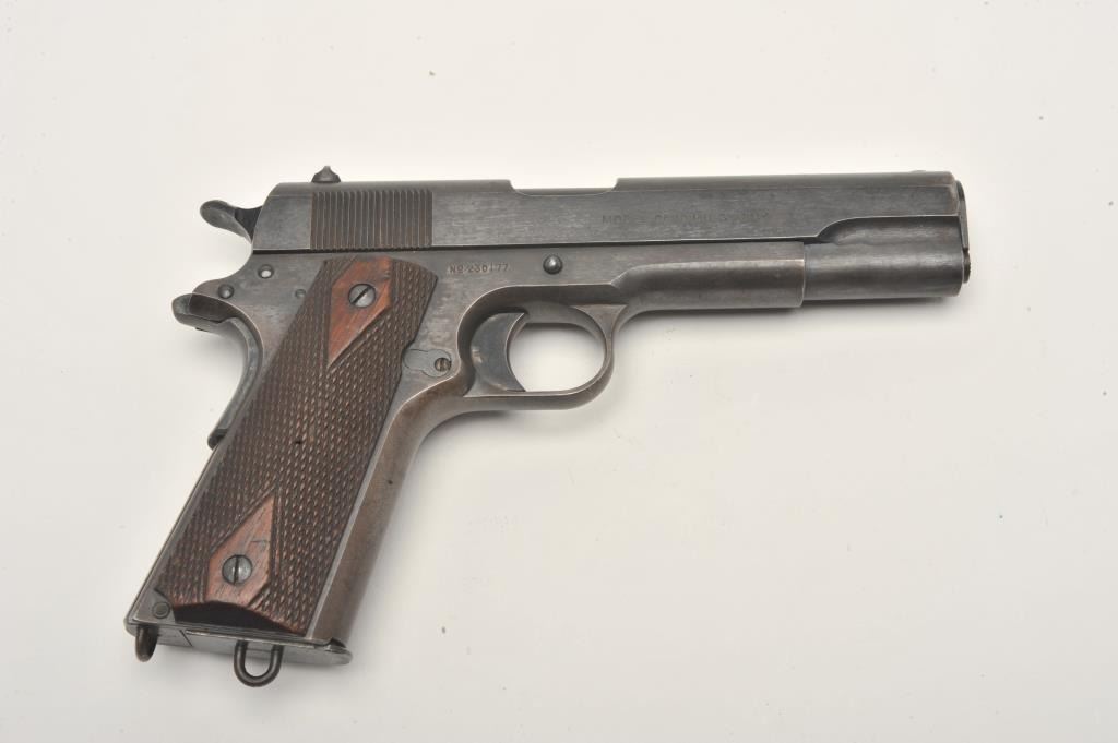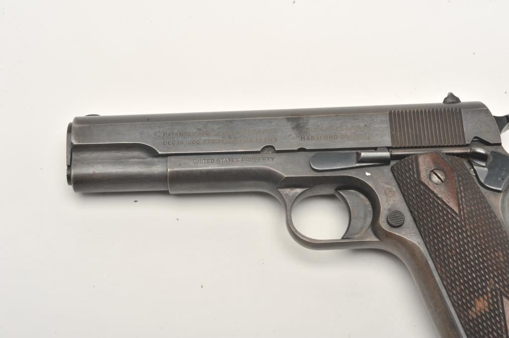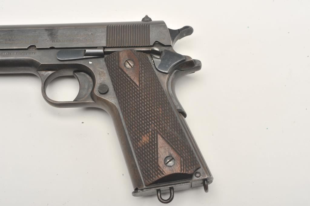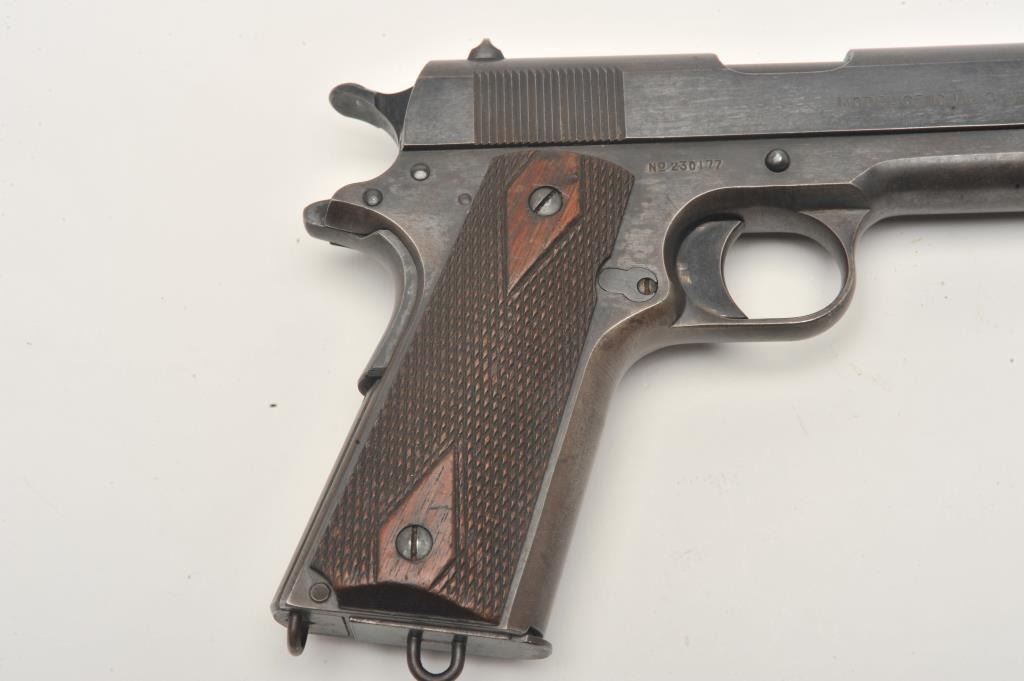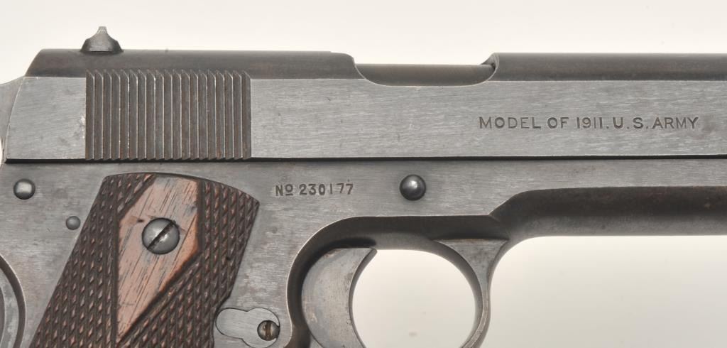 United States Property marked Colt Model 1911 semi-automatic pistol, .45 caliber, 5” barrel, military blued finish, checkered wood grips, two tone lanyard ring magazine, S/N 230177, in overall very good to near finecondition showing the majority of its military finish, very good bore, crisp action, sharp markings and very good grips. (C&R/No PPT). Est.: $1,500-$3,000.
