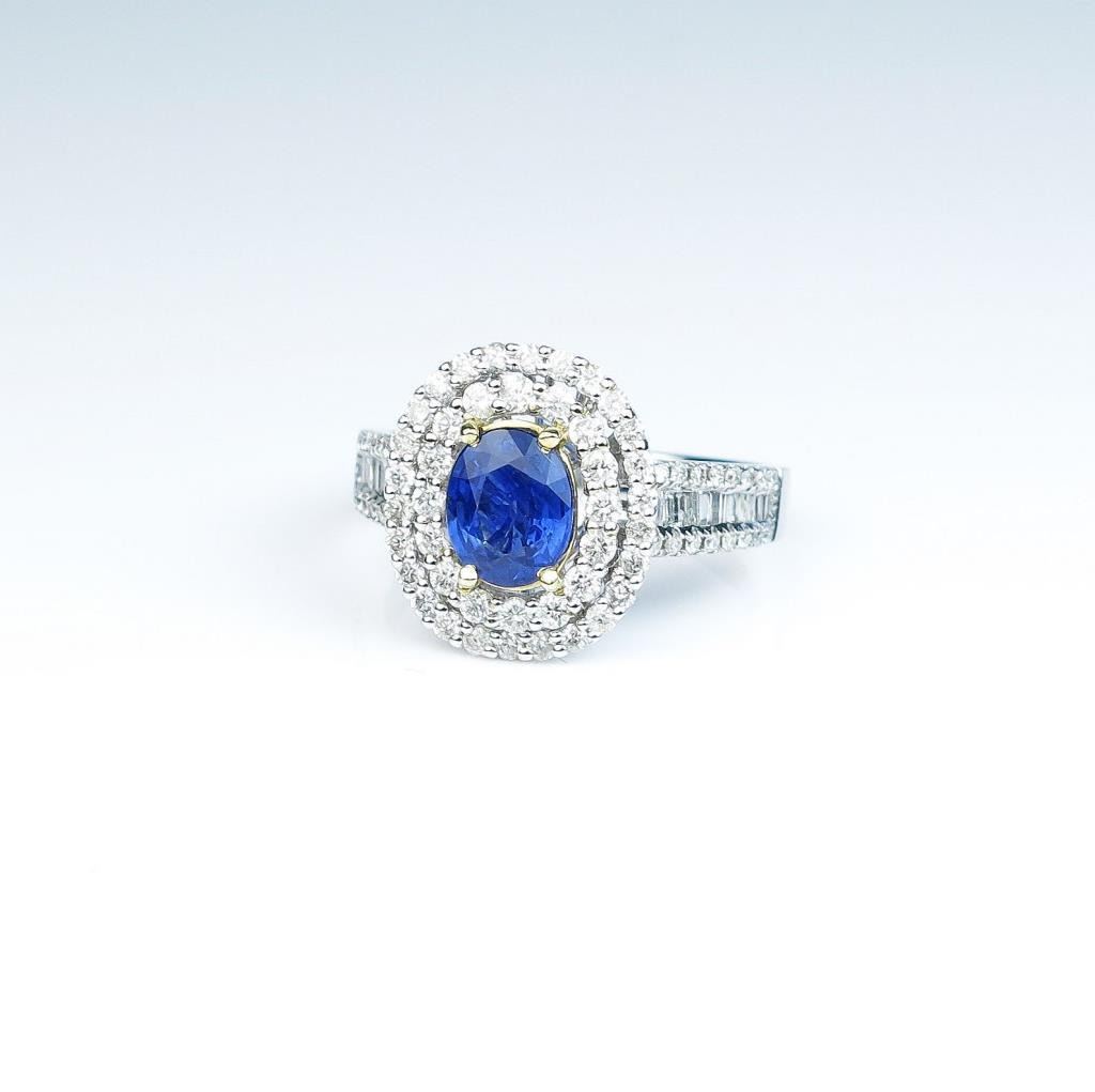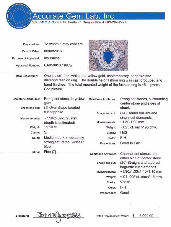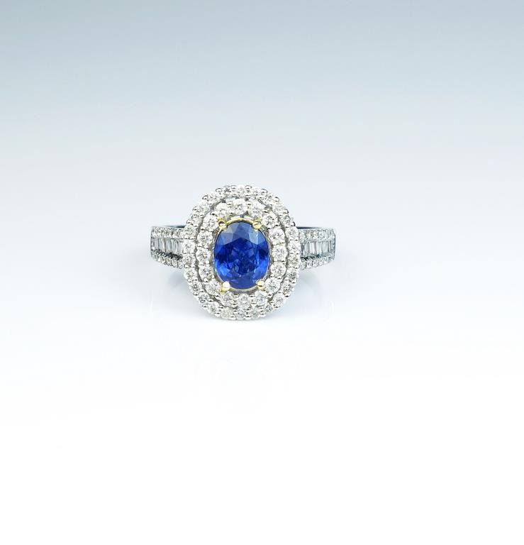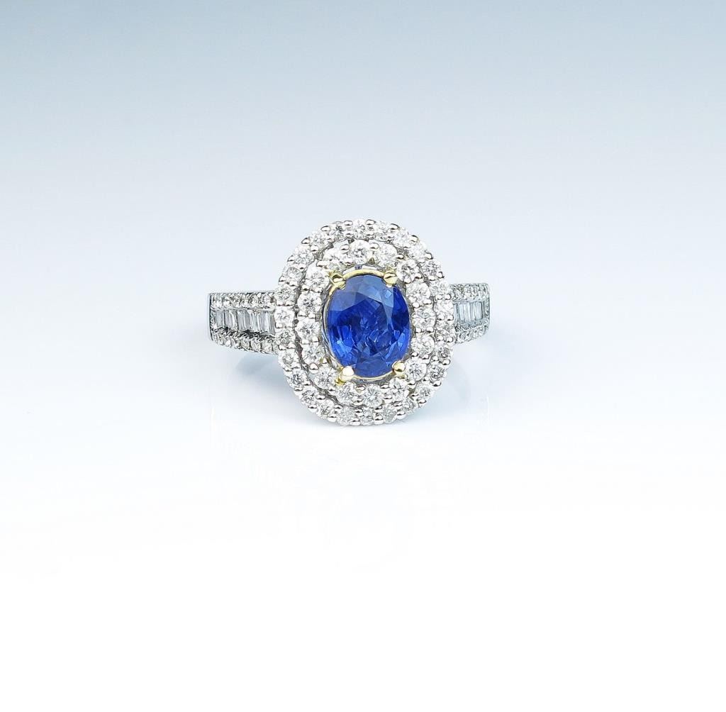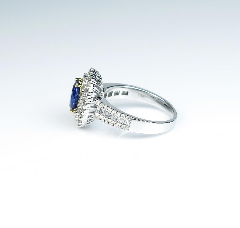 Gorgeous ladies ring featuring a fine cornflower blue Sapphire weighing approx. 1.10 carats and surrounded by over 95 round and baguette cut diamonds weighing approx. 1.10 carats of F-G colors and VS/I clarityset in a 14 karat two tone gold setting. Retail $5,000-$7,000 Estimates $3,000-$5,000 Please see Full Appraisal