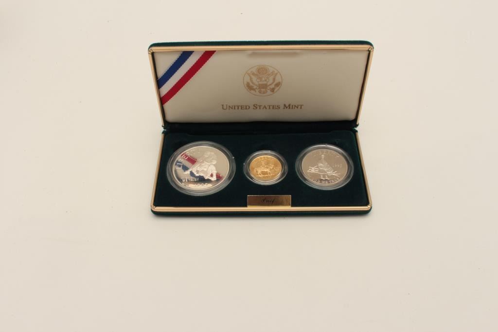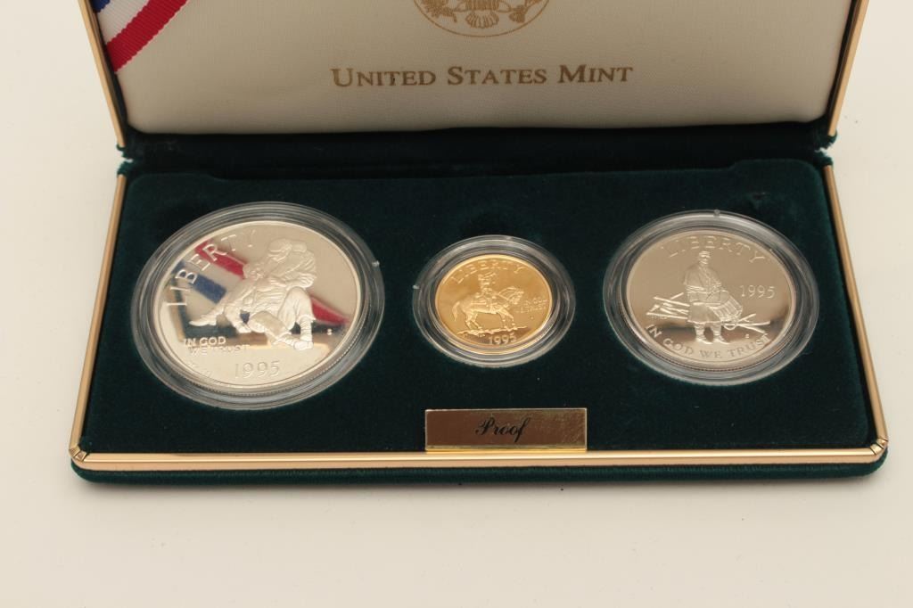 1995 Civil War Battlefield Comm. Set issued by U.S. Mint Gold Five Dollar, of Civil War Bugler Art by Don Troiani. Silver Dollar, Silver Half Dollar. Proof in Box with Certificate. Est:$400-800