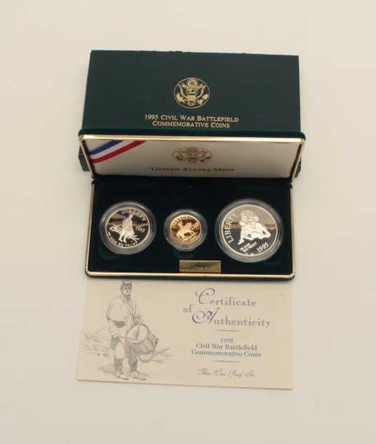 1995 Civil War Battlefield Comm. Set issued by U.S. Mint Gold Five Dollar, of Civil War Bugler Art by Don Troiani. Silver Dollar, Silver Half Dollar. Proof in Box with Certificate. Est:$400-800