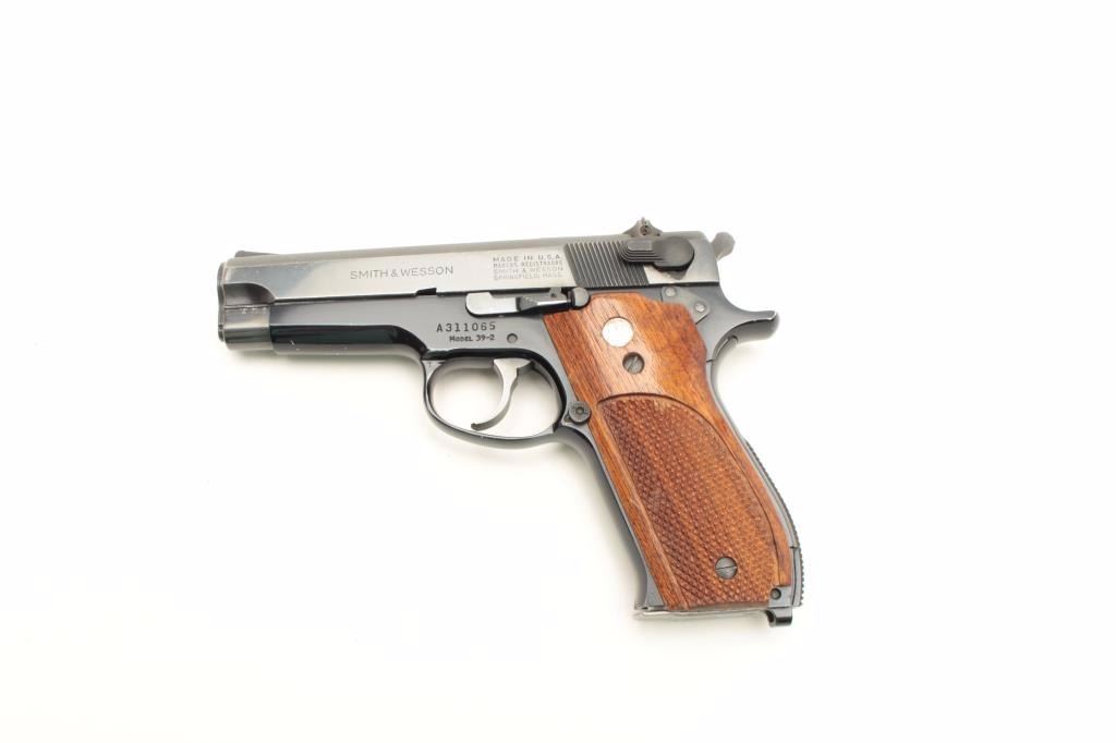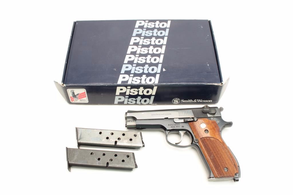 Smith & Wesson Model 39-2 semi-automatic pistol, 9mm caliber, 4” barrel, blued finish, checkered wood medallion grips, two extra magazines and with a factory cardboard box and instructions, S/N A311065, in overallfine condition displaying the majority of its original finish, fine bore, crisp action, sharp markings and fine grips. (Modern/No PPT/NO CALIF. SALE). Est.: $250-$500.