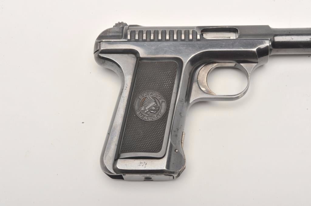 Savage semi-automatic pistol, 7.65mm caliber, 3.75” barrel, blued finish, checkered black hard rubber grips, S/N 175296, in overall very good to fine condition displaying the majority of its original finish with somemuzzle and high point wear, very good bore, crisp action and markings, fine grips. (C&R/No PPT). Est.: $300-$600.