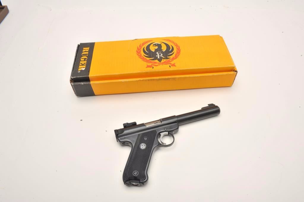 Ruger Mark II Target semi-automatic pistol, .22LR caliber, 5.5” barrel, blued finish, checkered grips, one extra magazine, in factory cardboard box with instructions, S/N 214-38370, in near new condition.(Modern/No PPT/NO CALIF. SALE). Est.: $200-$400.