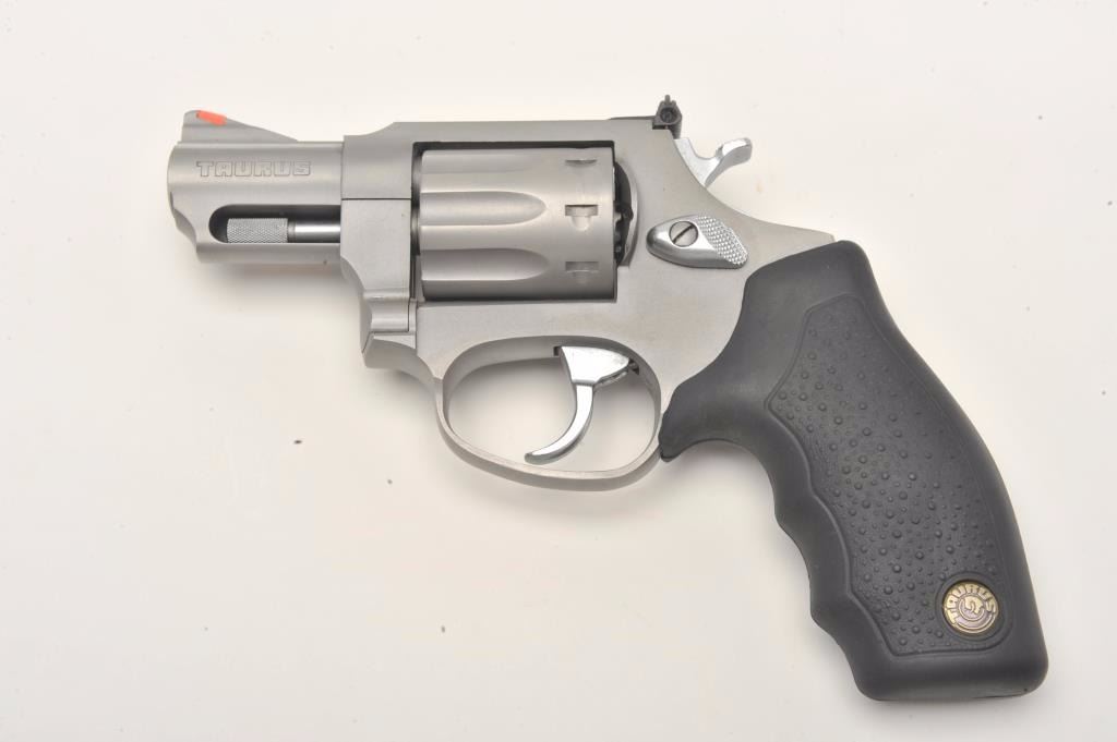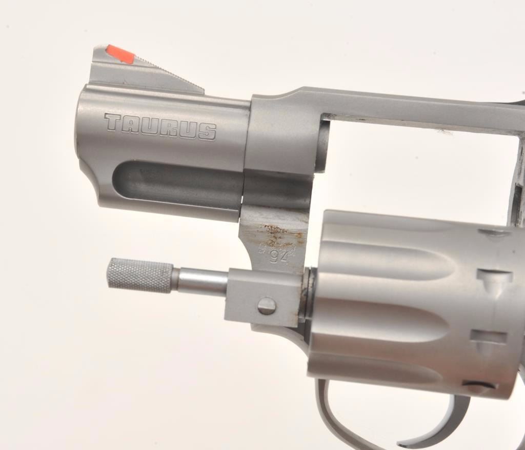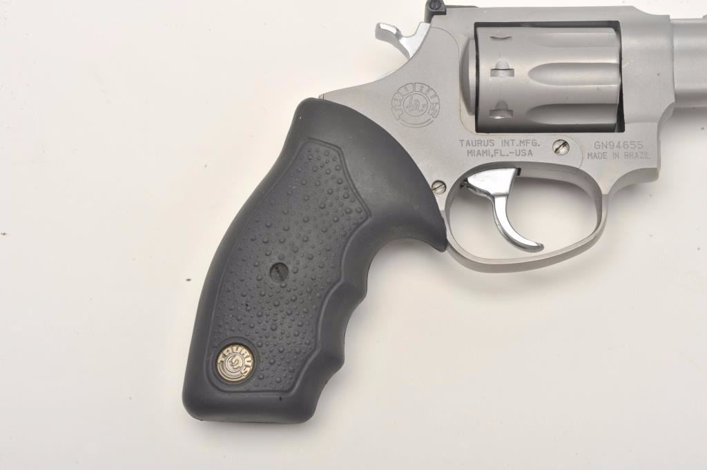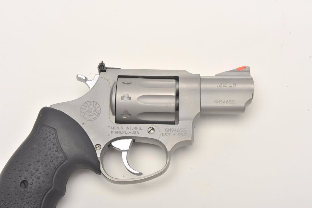 Taurus DA revolver, .22LR caliber, 2” barrel, satin finish, stippled hard rubber grips, S/N GN94655, in overall fine condition with fine bore, crisp action and fine grips. In factory cardboard box with instructions. (Modern/No PPT/NO CALIF. SALE). Est.: $250-$500.