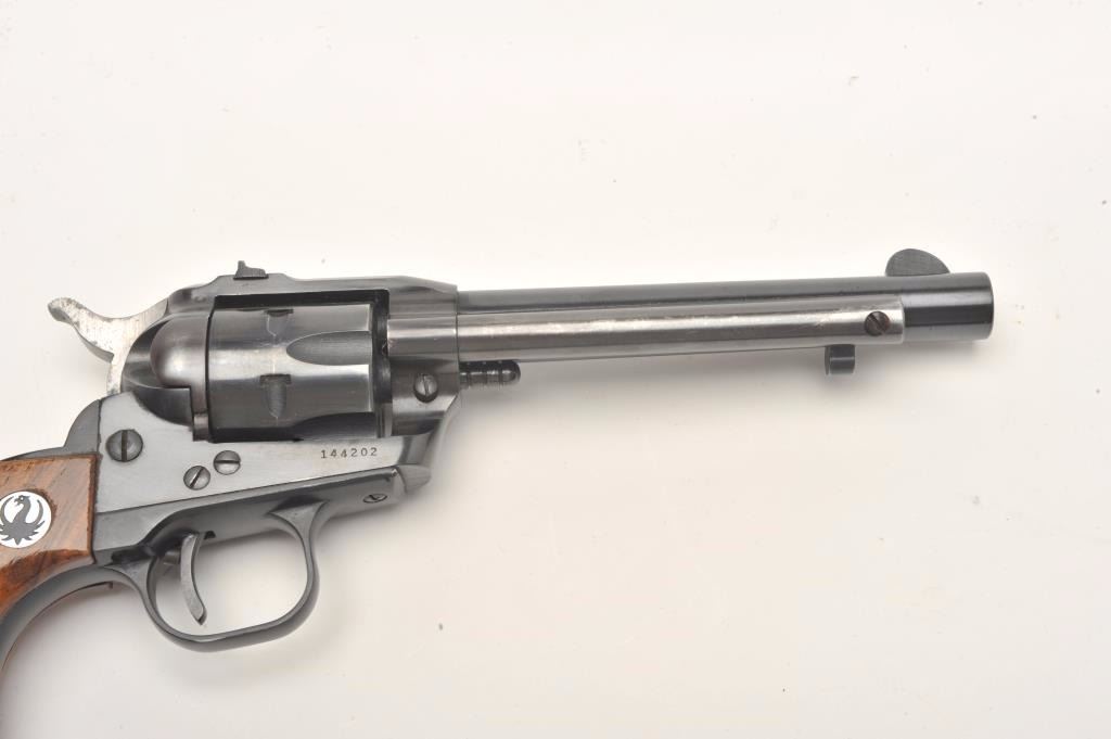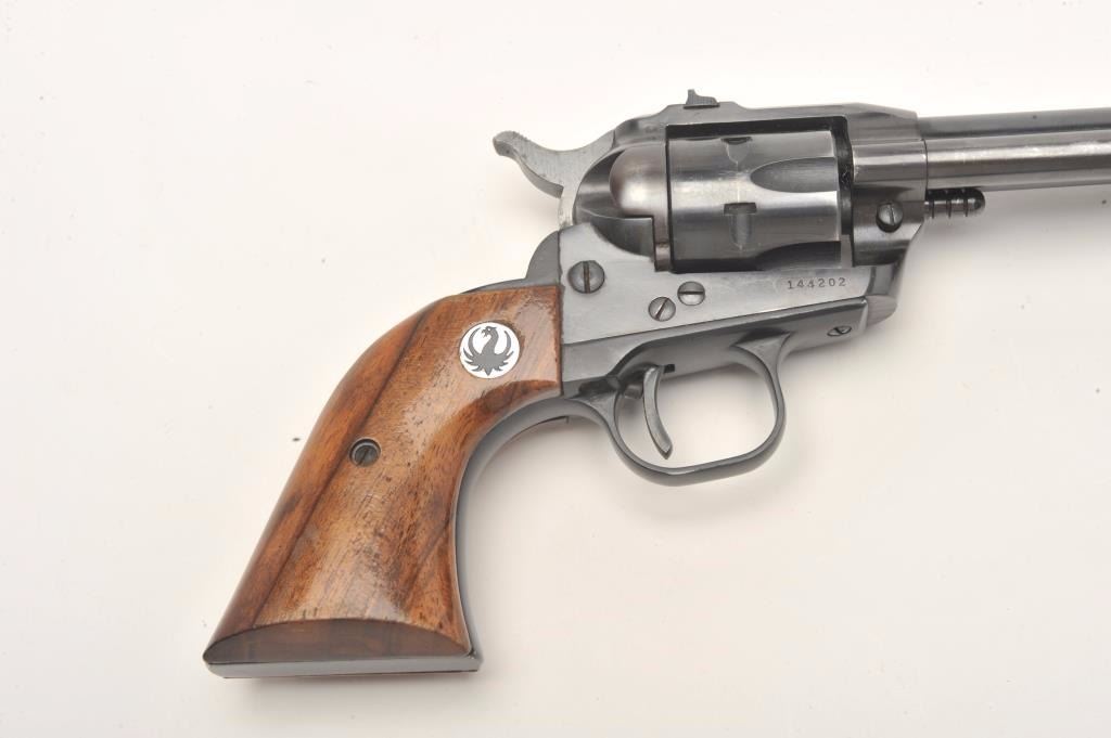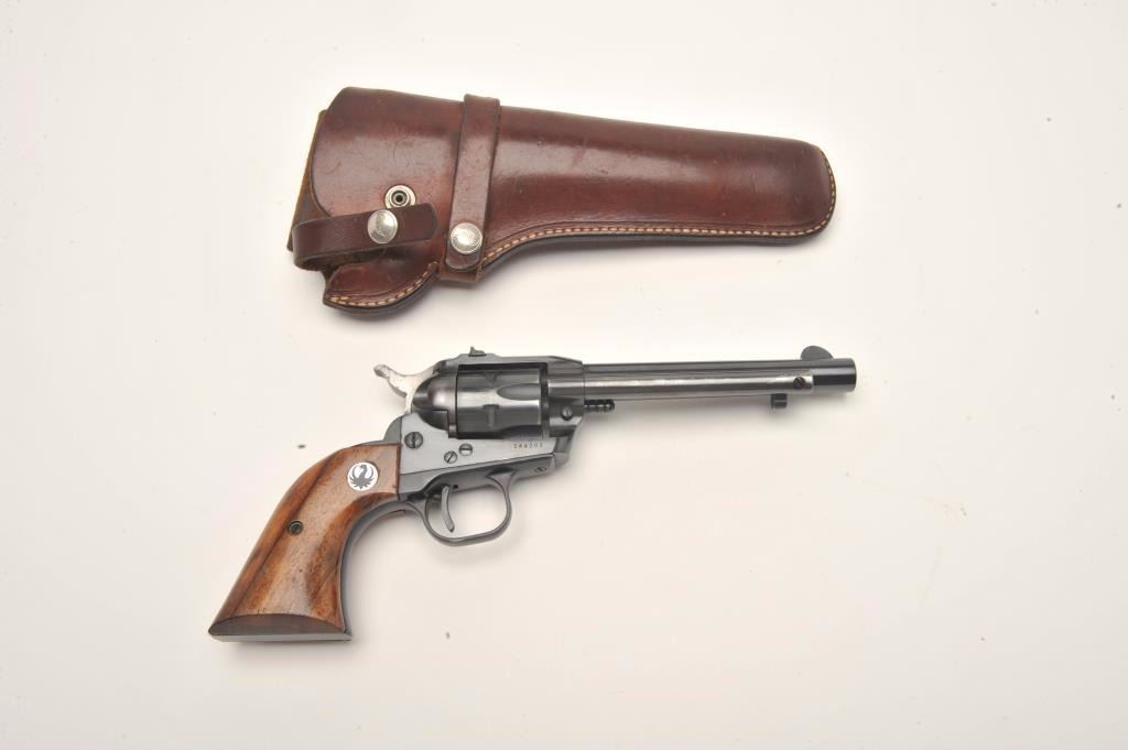 Ruger Single Six Model revolver, .22 caliber, 5.5” barrel, blued finish, wood medallion grips, S/N 144202, in overall very good to fine condition displaying the majority of its original blued finish, very good bore, crisp action and markings, very good to near fine grips. Accompanied by a leather Hunter brand holster. (Modern/No PPT). Est.: $250-$500.