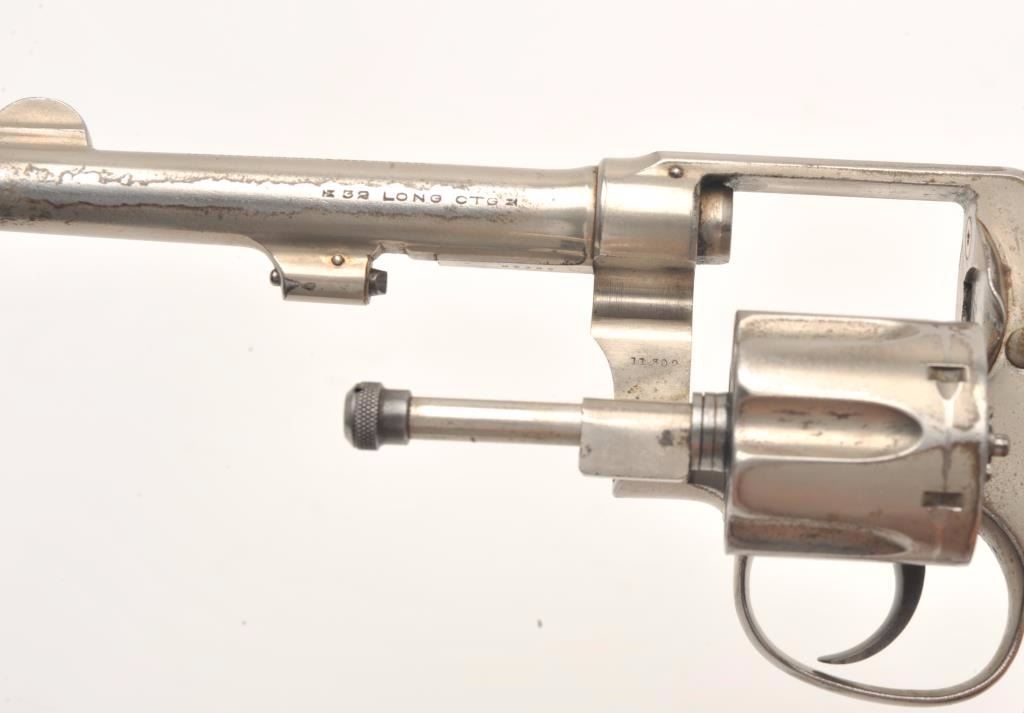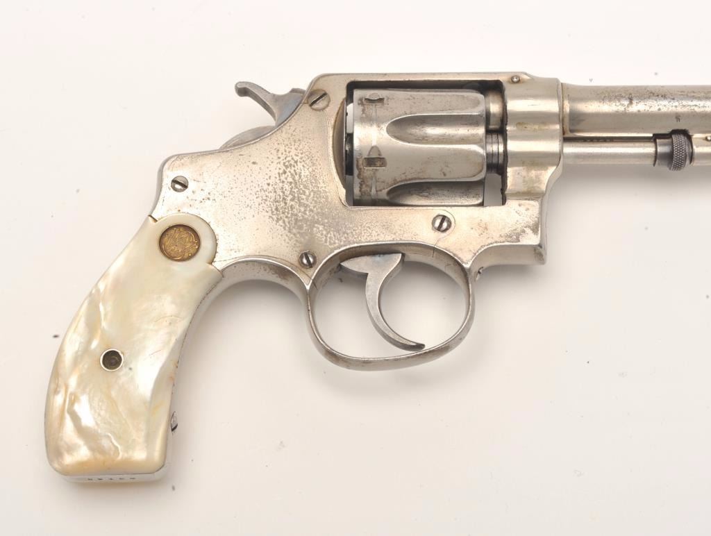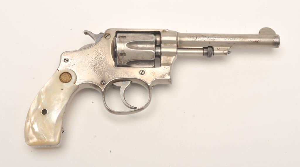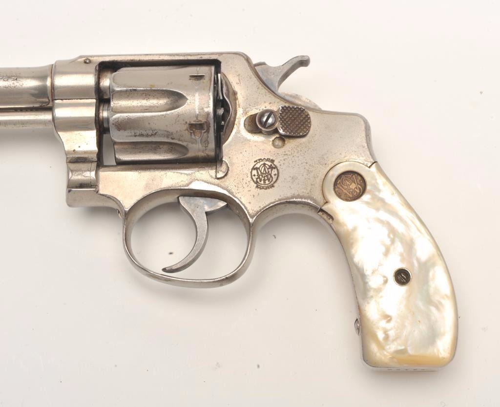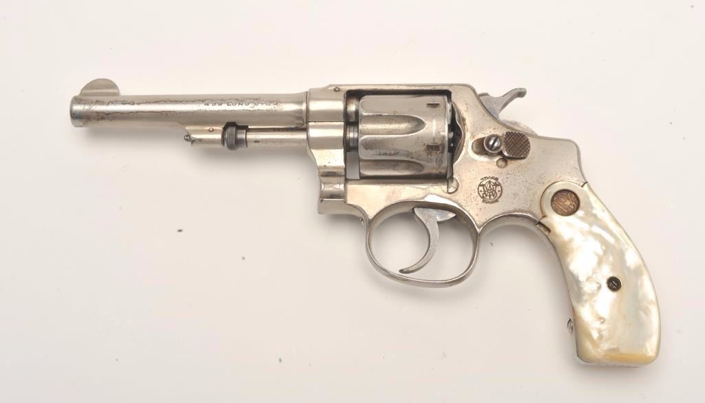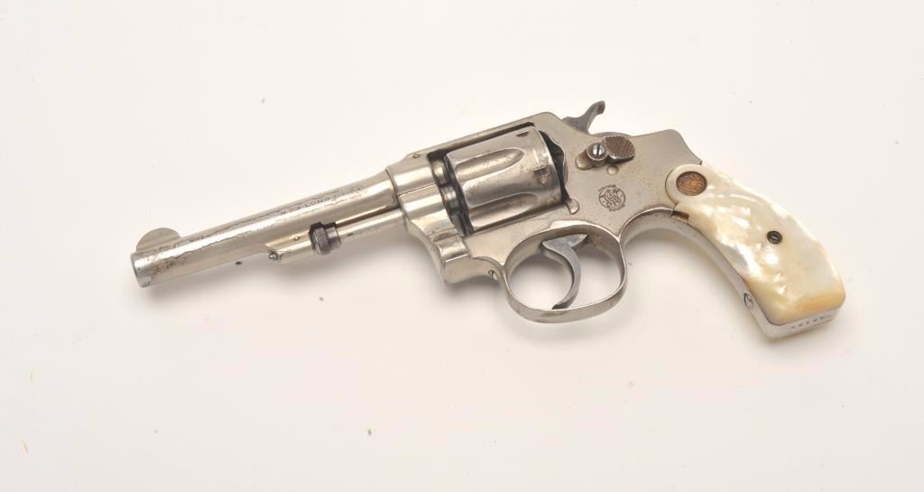 Lot 1195 Smith & Wesson five-screw pocket DA revolver, .32 Long caliber, 4.25” barrel, nickel finish, pearl